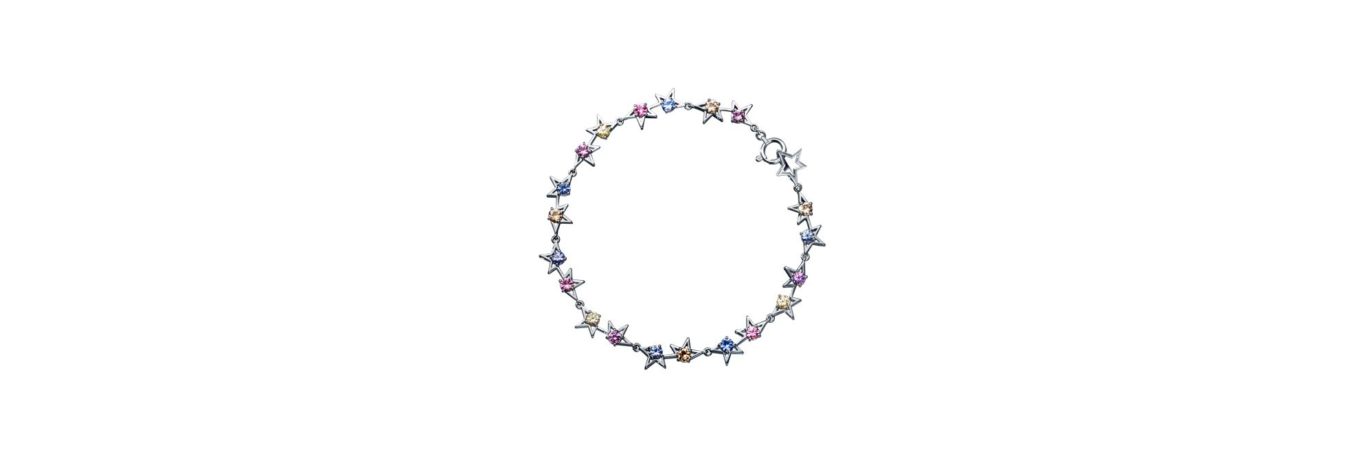 这款手链以抽象前卫的设计勾勒出午夜星空,每颗铂金星星中均点缀一颗梦幻的彩色蓝宝石。虹彩般绚丽的宝石仿佛悬浮于半空中,交织出悦耳的色彩和弦。