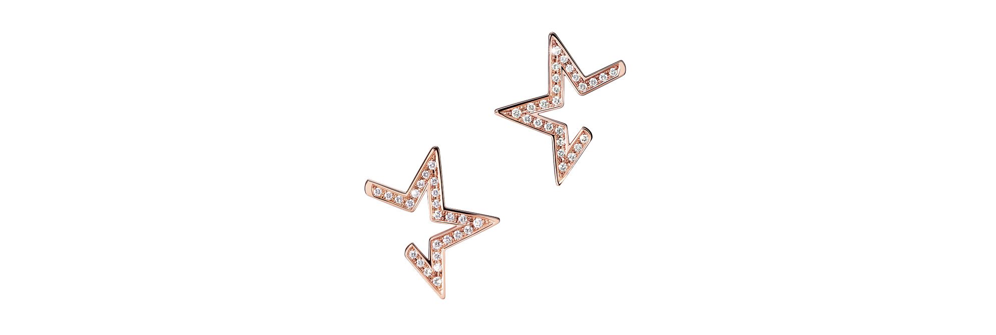 这款耳环以抽象前卫的设计勾勒出午夜星空。樱花金外框的夺目线条充分运用空间,营造出活泼俏皮的造型,而优雅璀璨的钻石则彰显出华丽美感。