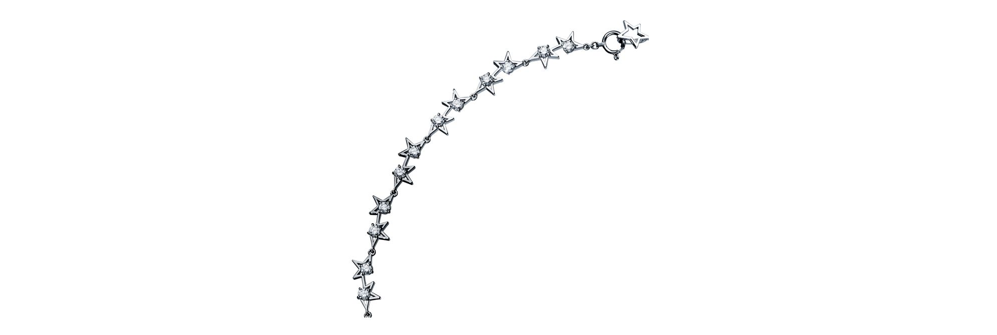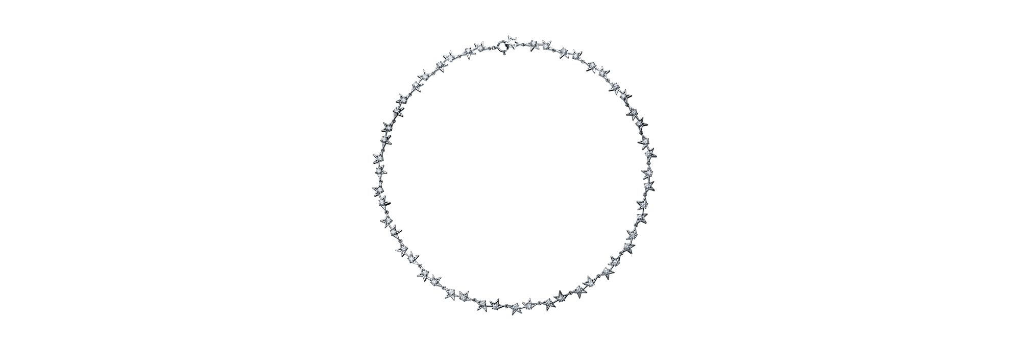 这款项链以抽象前卫的设计勾勒出午夜星空,闪烁繁星与炫目铂金交相辉映,设计精美,堪称一件现代艺术品。璀璨耀眼的钻石幻化成繁星点点,仿佛悬浮于半空中。
