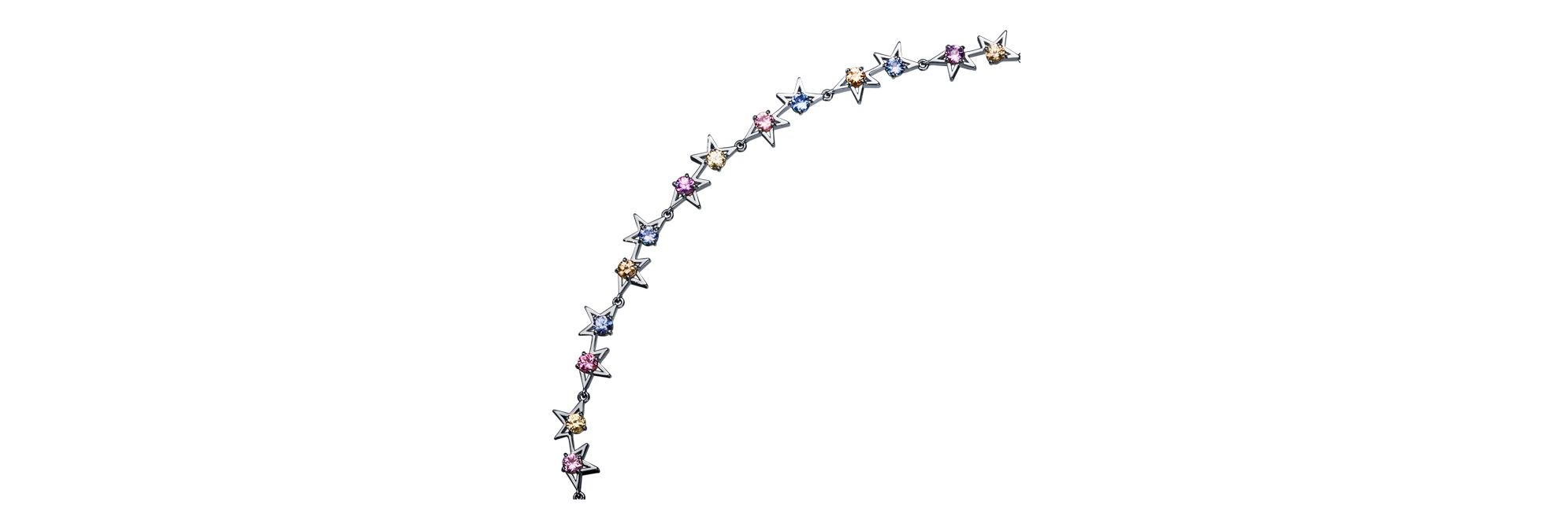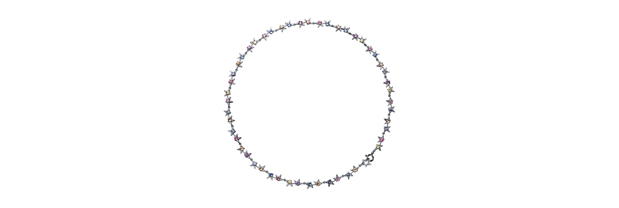 这款项链以抽象前卫的设计勾勒出午夜星空,每颗铂金繁星之中均点缀有一颗梦幻的彩色蓝宝石。虹彩般绚丽的宝石仿佛悬浮于半空中,交织出悦耳的五彩和弦。