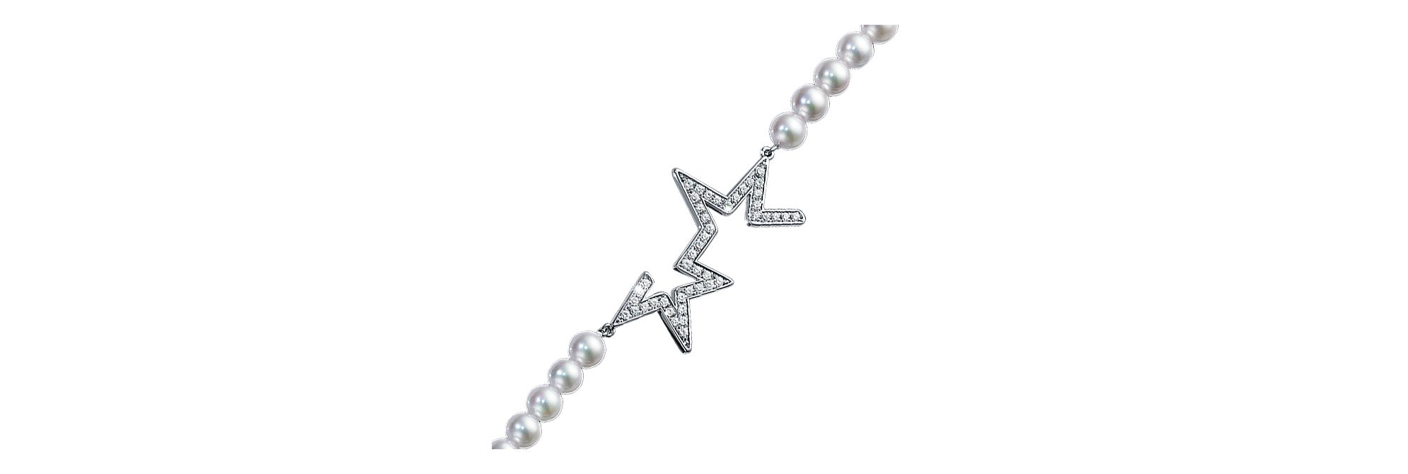 这款阿古屋珍珠项链以抽象前卫的设计勾勒出午夜星空,棱角分明的线条令人眼前一亮。炫目的白金外框上点缀精美的密镶钻石,与棱角分明的线条互相映衬,彰显肌肤自然光泽。这件作品长约90厘米,可作为双层项链佩戴。
