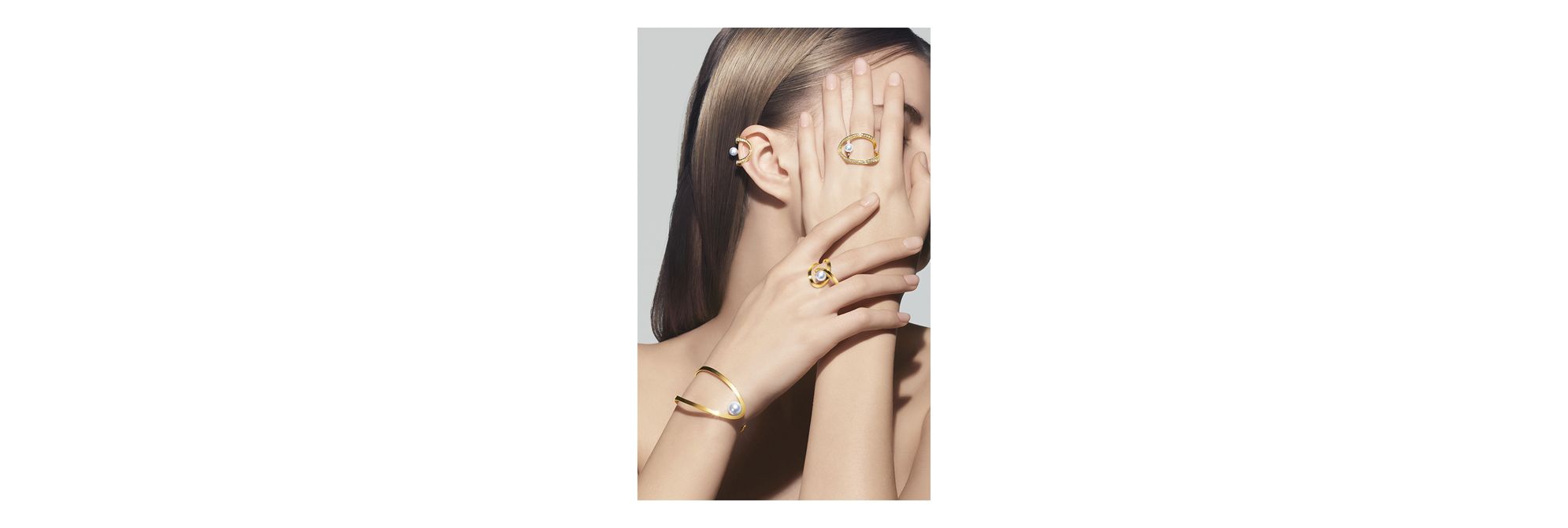 此系列宛若流光溢彩的水下极光,点亮了海底的神秘世界。这款手镯以黄金圆圈环拥一颗阿古屋珍珠,缀于手腕外侧,尽显华美设计。