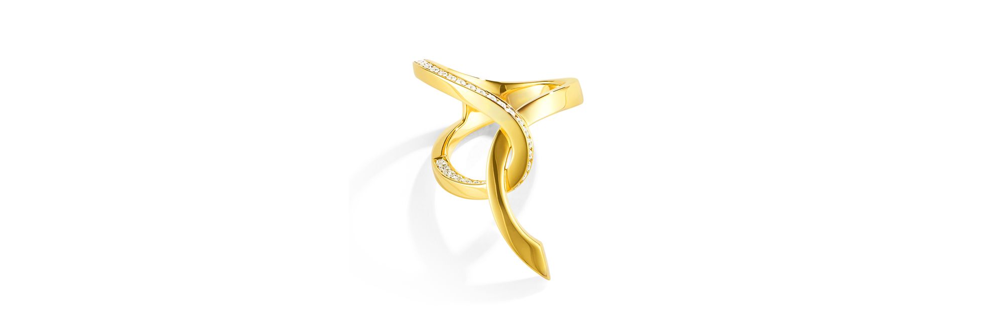 此系列采用优雅的弧线设计,勾勒水下梦幻的光影律动。这款戒指采用三维立体设计,以黄金铸就柔美曲线,萦绕指间,流露出一丝风趣。钻石的铺镶与弧线和谐契合,充分彰显TASAKI的精湛工艺。
