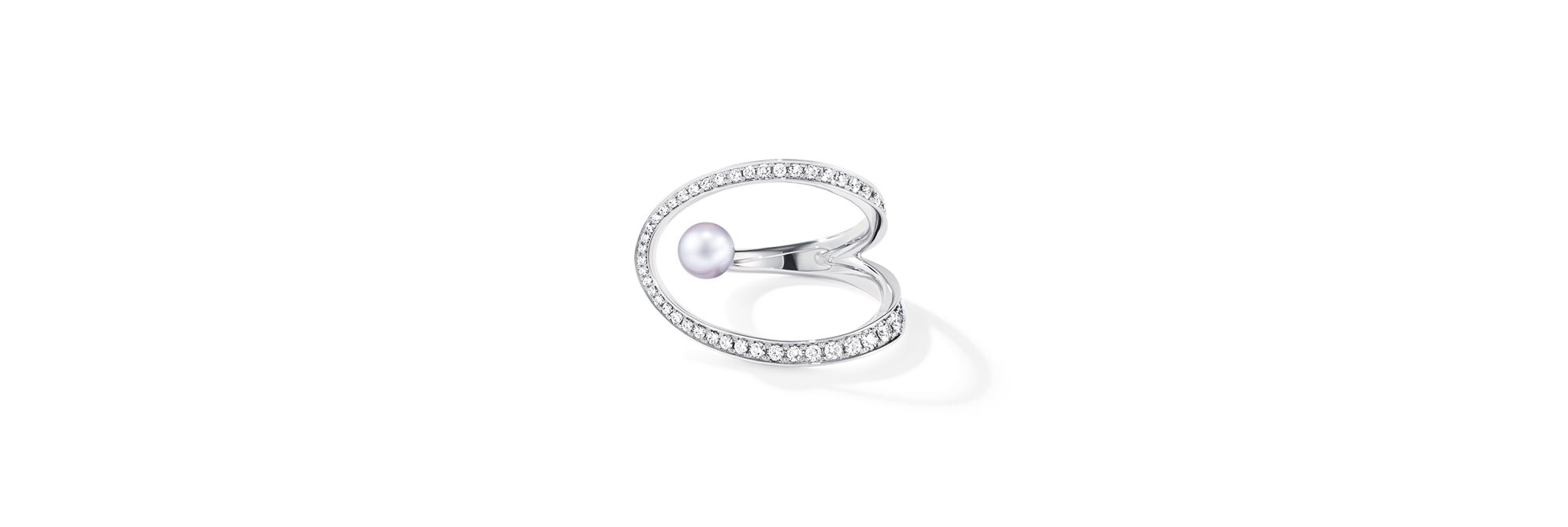 此系列宛若流光溢彩的水下极光,点亮了海底的神秘世界。这款戒指以璀璨钻石点缀白金圆圈,风格优雅,又不乏时尚魅力。指间的阿古屋珍珠仿若悬浮于半空中。