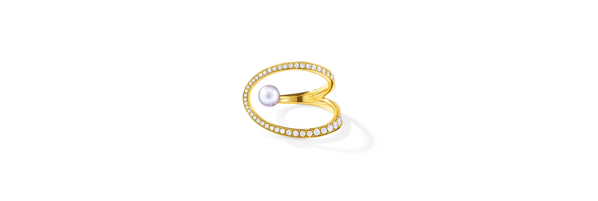 此系列宛若流光溢彩的水下极光,点亮了海底的神秘世界。这款戒指以璀璨钻石点缀黄金圆圈,风格优雅,又不乏时尚魅力。指间的阿古屋珍珠仿若悬浮于半空中。