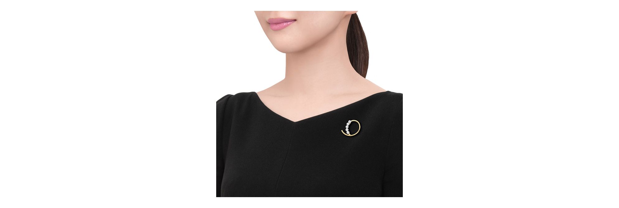 “a fine balance”胸针的小珍珠与别具一格的黄金弧线相得益彰,呈现柔和的和谐美感,在领口处营造一抹轻盈灵动的俏皮气息。