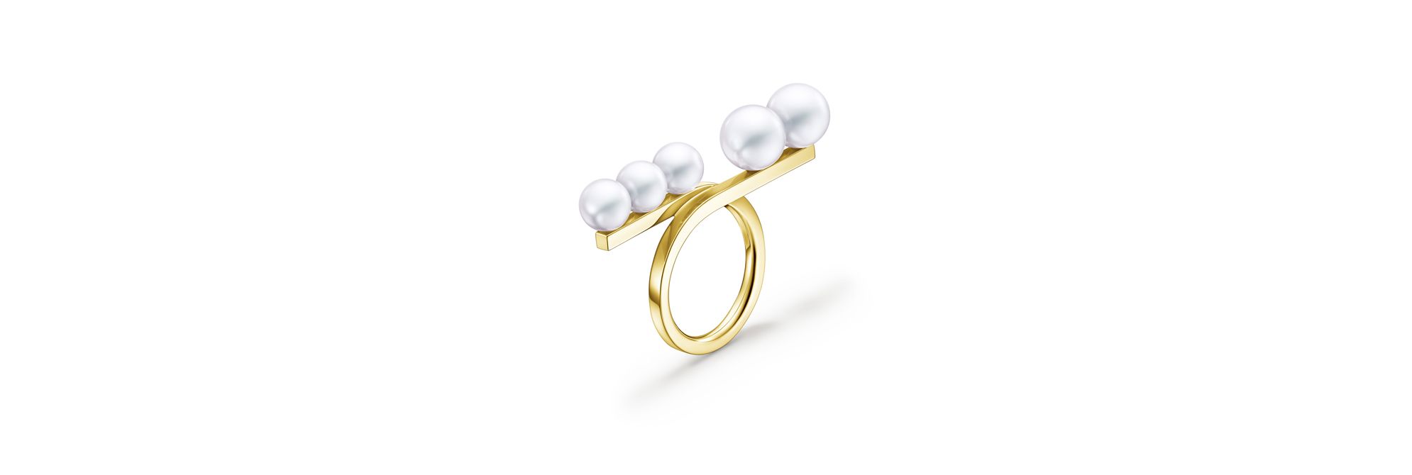 TASAKI “balance loop”系列戒指演绎独具魅力、时尚且前卫的风格。纯净的18K黄金平衡杆戒圈萦绕指间,不对称地向左右两侧延伸,其上冠以五颗大小不一的阿古屋珍珠。无论正式或休闲造型皆可搭配。
