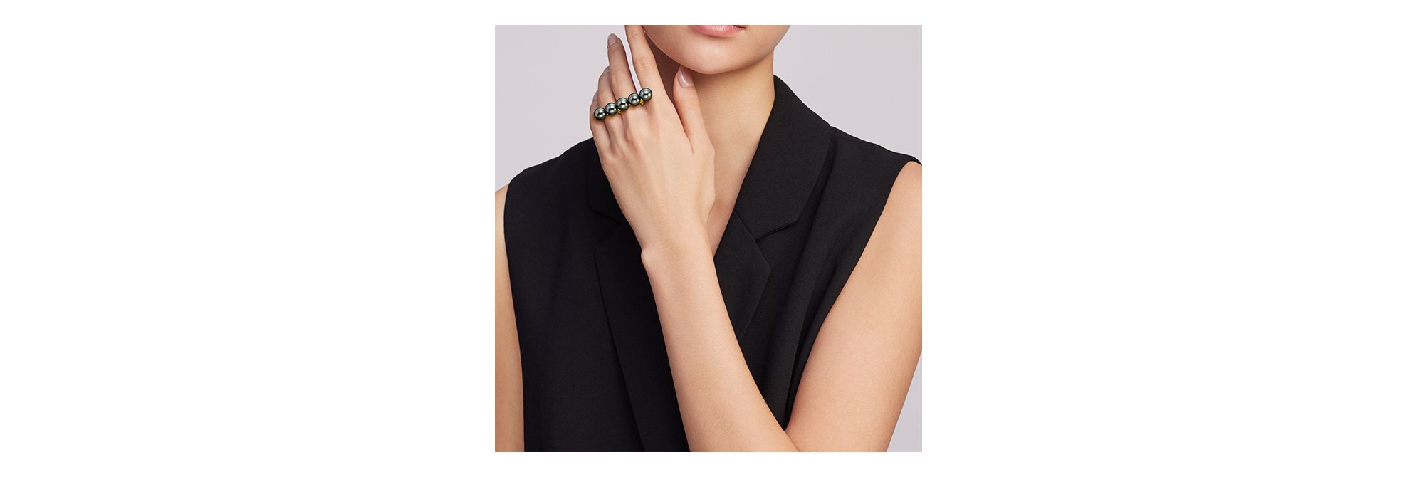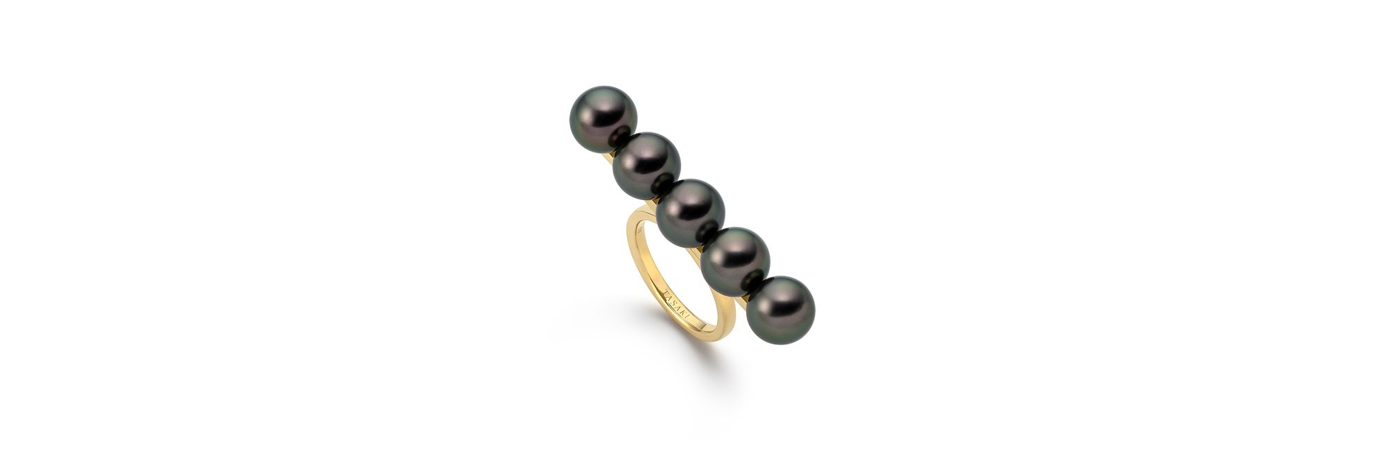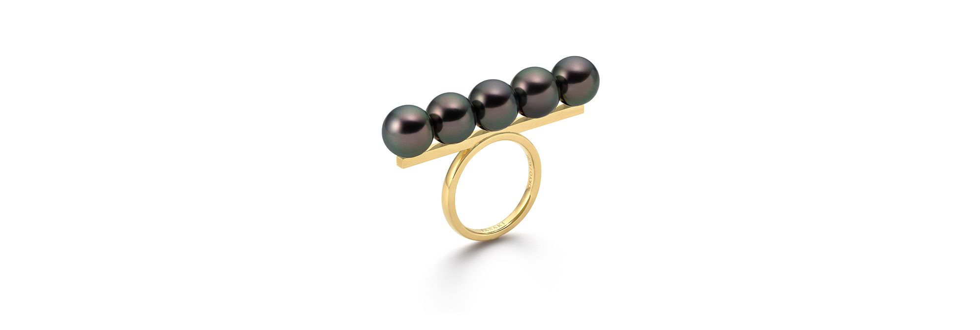 “balance”平衡系列颠覆了珍珠珠宝的传统概念,由此揭开该系列的华丽序幕。这款戒指呈现五颗珍珠悬浮于黄金直杆上的别致设计。每颗精心养殖的南洋黑珍珠,均呈现相同的形状、大小、光泽、颜色和品质,将作品的出众魅力演绎得淋漓尽致。
