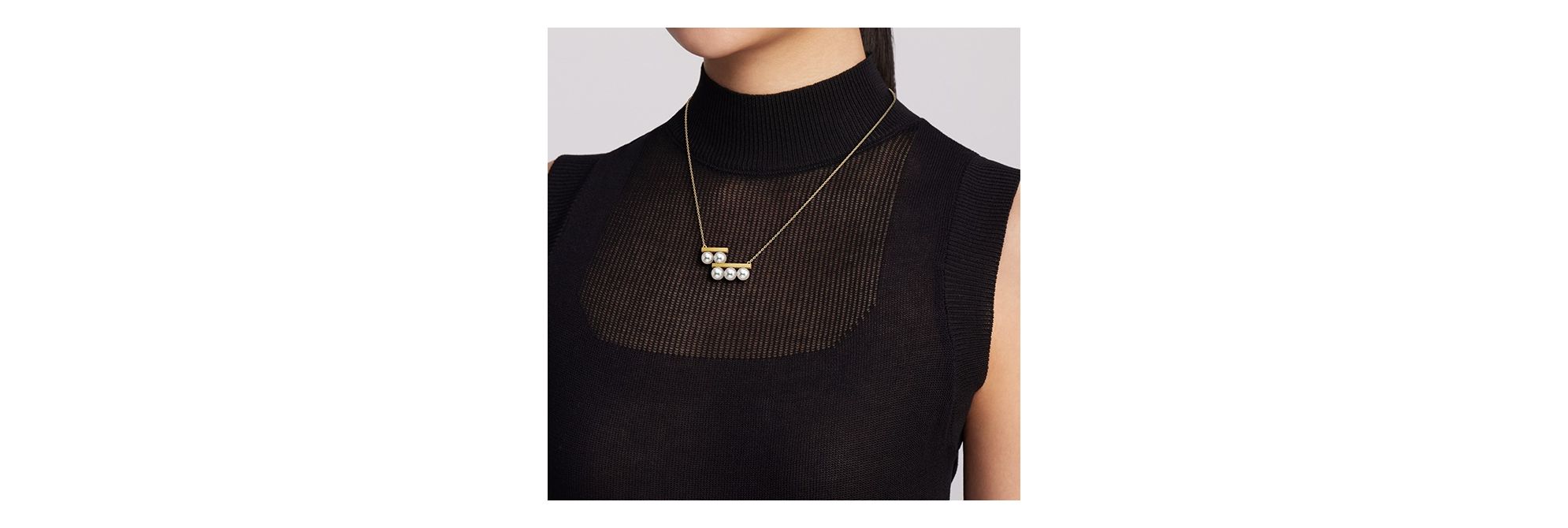 TASAKI经典的“balance”系列颠覆了大众对珍珠珠宝的传统印象,而“balance step”系列更将这一设计推向全新高度。五颗珍珠排列于两根高低错落的18K黄金平衡杆上,以不对称却充满平衡之感的设计为其特色。这款项链设计奢华精致,阿古屋珍珠的柔和光泽与18K黄金的低调光彩互相映衬,于颈间绽现光芒。