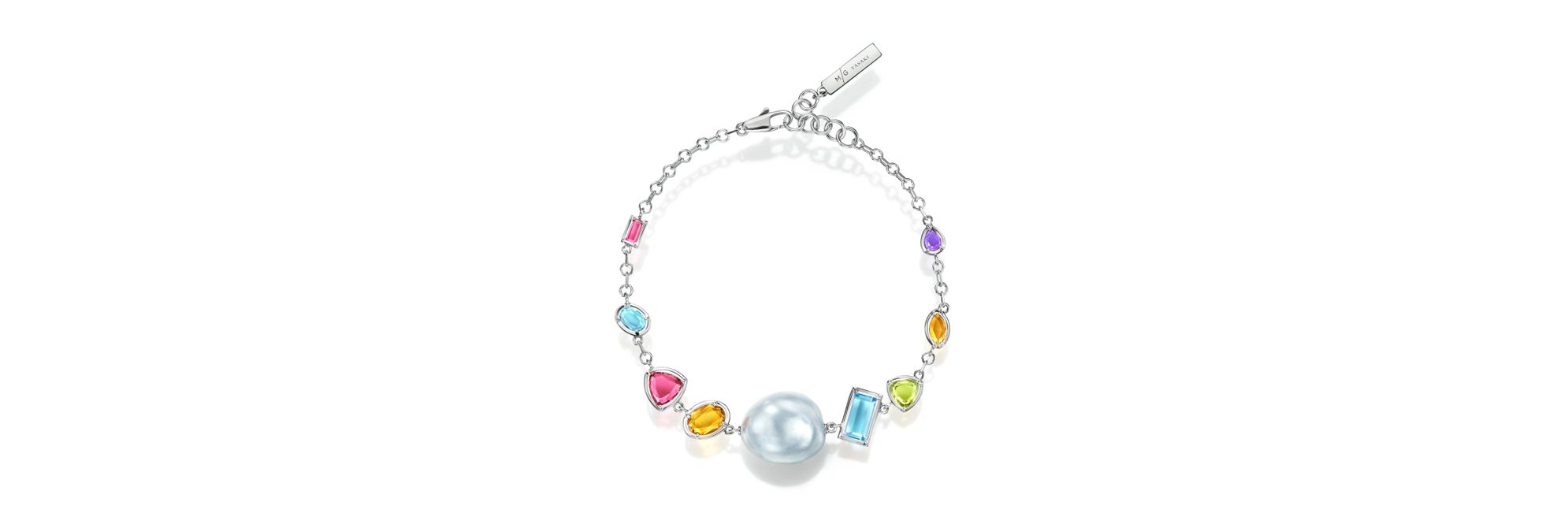 TASAKI “BAROQUE PEARLS”系列珠宝将天然形态的巴洛克南洋珍珠与多种切工的彩色宝石相结合,呈现华美的时尚风格。这款手链饰有珍珠和彩色宝石,每种颜色都呈现出不同的个性风采。 可佩戴任一个方向,展现非凡魅力。