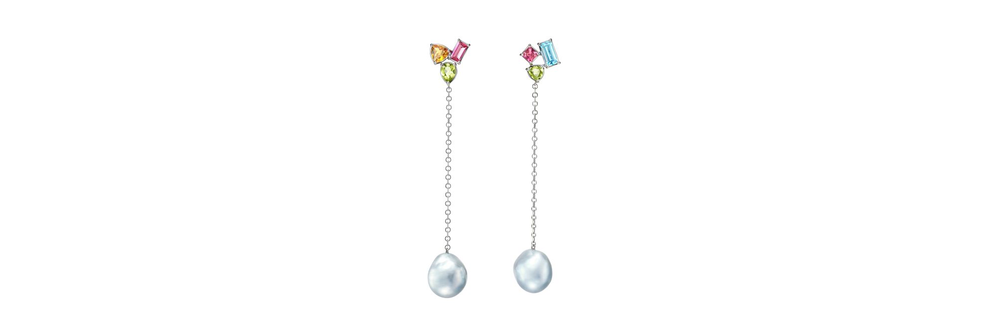 TASAKI “BAROQUE PEARLS”系列珠宝将天然形态的巴洛克南洋珍珠与多种切工的彩色宝石相结合,呈现华美的时尚风格。这款耳环设计优雅,搭配长链。