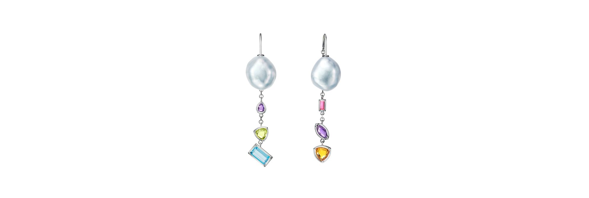 TASAKI “BAROQUE PEARLS”系列珠宝将天然形态的巴洛克南洋珍珠与彩色宝石相结合,呈现华美的时尚风格。这款耳环以不对称方式排列彩色宝石,搭配珍珠耳托,散发俏皮气息。