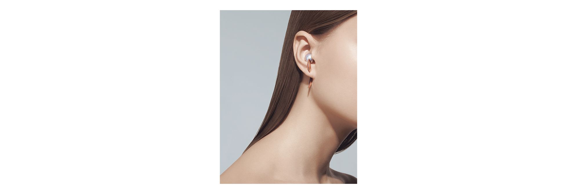 这款耳环以珍珠诠释漂浮于平静海面上的浮标,令人浮想联翩。珍珠恰到好处地缀于耳畔,樱花金弧线沿耳垂从向后延展,勾勒耳际线条。
