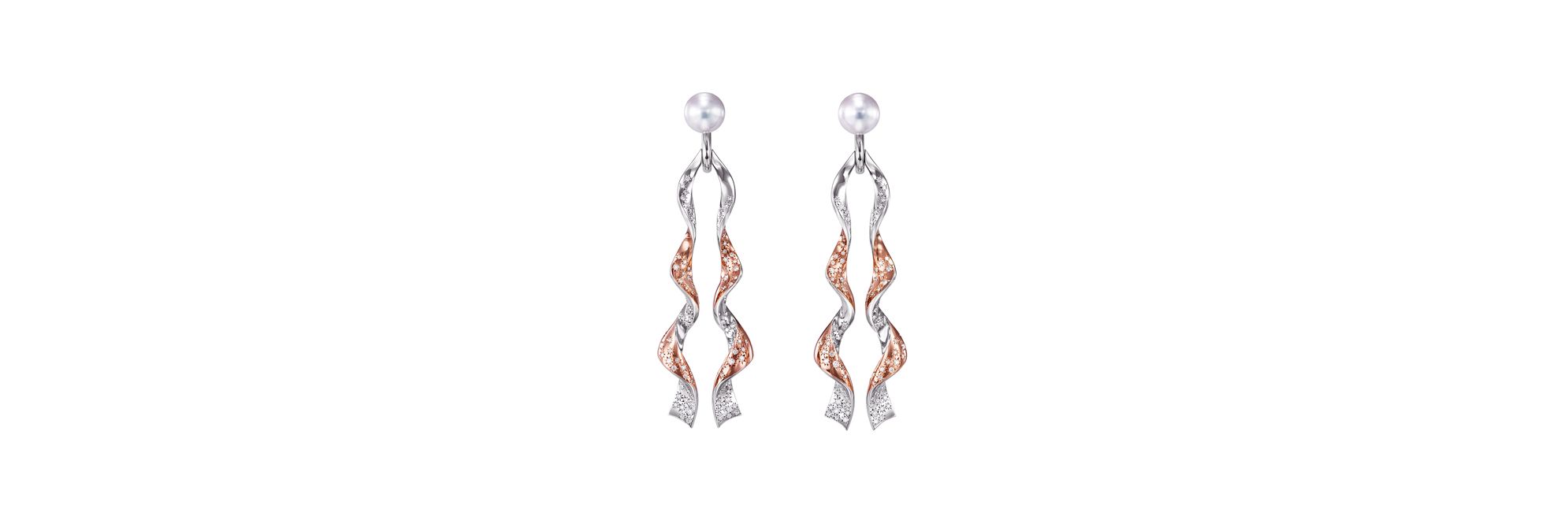 “Cascade”系列呈现瀑布之美,飞流而下的水珠在阳光照射下流光溢彩。这款耳环在优雅的白金和樱花金曲线上点缀钻石,南阳白珍珠如同在充满韵律感的线条上涓涓流淌,尽显极致奢华。