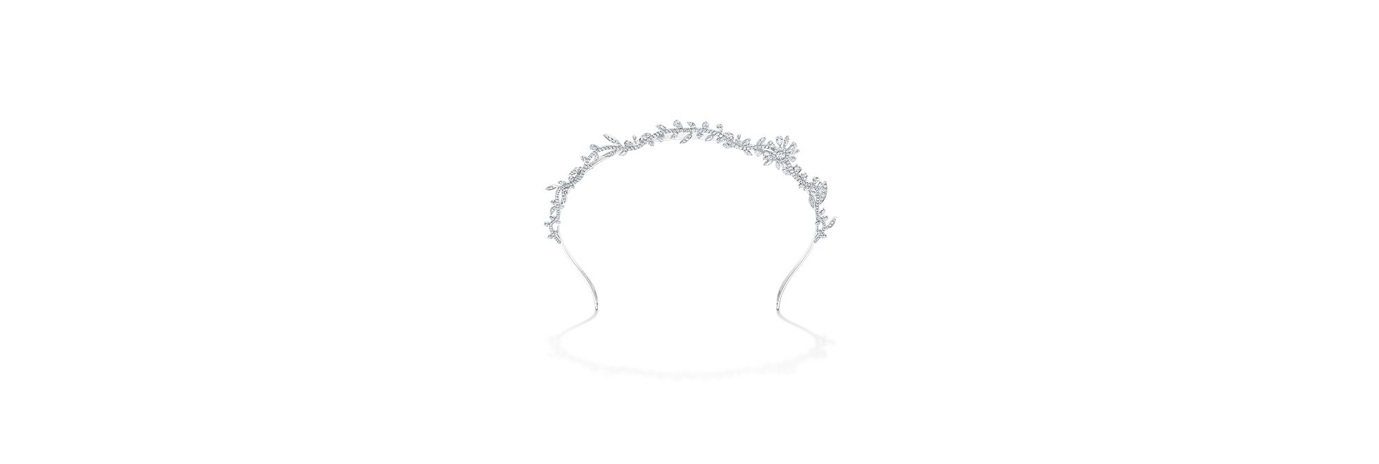 “Clare”系列以花朵图案为主角,一朵朵小花于藤蔓之上优雅绽放,并悉心镶嵌璀璨美钻。这款冠冕采用发圈设计,将花冠自然甜美的气质演绎得淋漓尽致。钻石的夺目光芒与18K白金的雅致光泽交相辉映,衬托新娘的纯洁美丽与优雅气质。