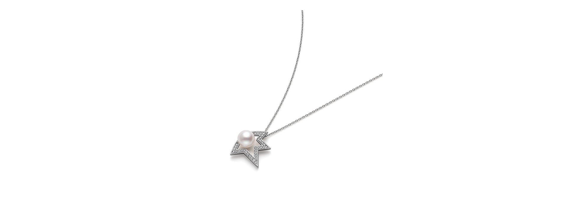 此系列设计风格现代新颖,令人联想起空中一闪而过的彗星。以优雅美学演绎经典造型,白金勾勒出富有艺术美感的造型轮廓,铺镶璀璨钻石,点缀一颗柔和莹润的阿古屋珍珠。这件俏皮动人的作品是您点缀颈间的首选。