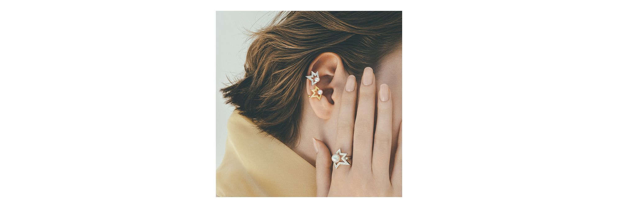 此系列设计风格现代新颖,令人联想起划破天际的闪亮彗星。经典设计融合极简风格,柔和莹润的阿古屋珍珠与富有艺术美感的黄金造型轮廓交相辉映。这款全耳式耳夹采用独特的圆润造型,适合右耳佩戴。充满特色的设计兼顾佩戴的舒适性。