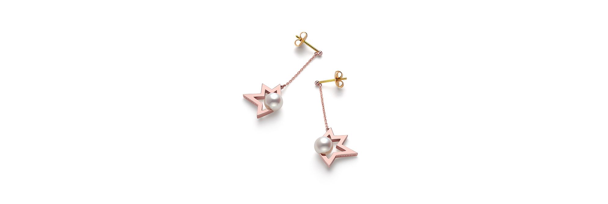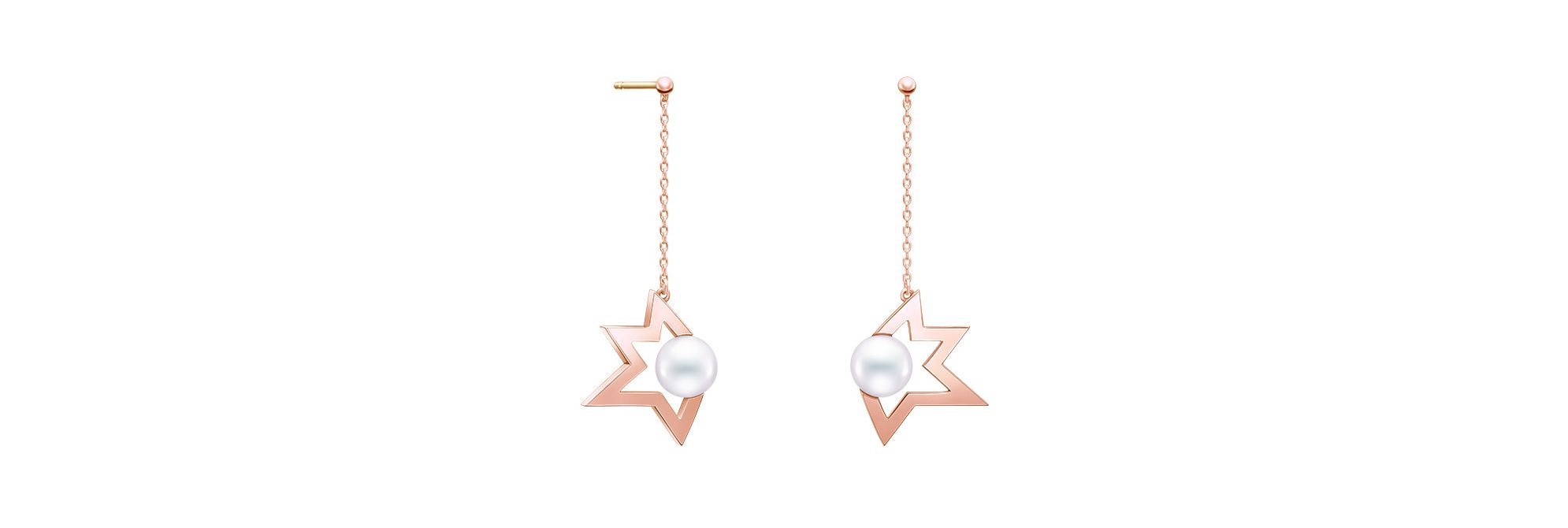 此系列设计风格现代新颖,令人联想起划破天际的闪亮彗星。这款耳环以富有艺术美感的樱花金轮廓与柔和莹润的阿古屋珍珠形成巧妙对比,于耳畔优雅摇曳。打造充满魅力且时尚的造型。
