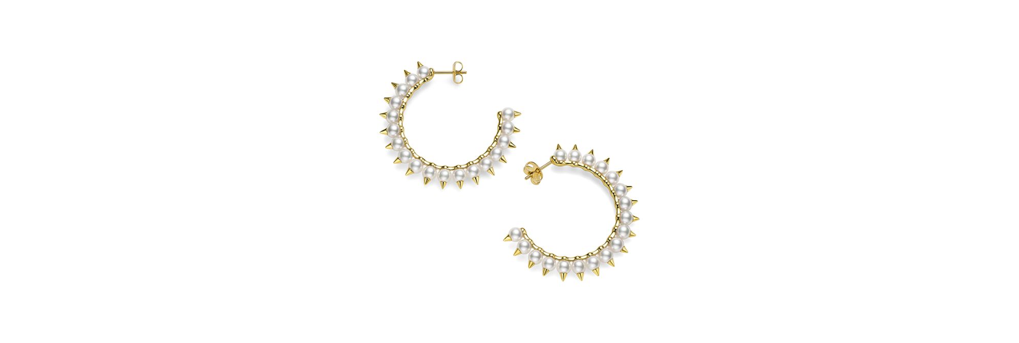 TASAKI danger tribe系列的创作灵感源于森林深处的食虫植物,设计糅合了其细致的轮廓与隐藏的尖刺,散发迷人气质。这件作品是danger系列中的经典圆环耳环,同样点缀了经典的小珍珠与黄金尖刺。大型尺寸彰显更加鲜明的个性风采。