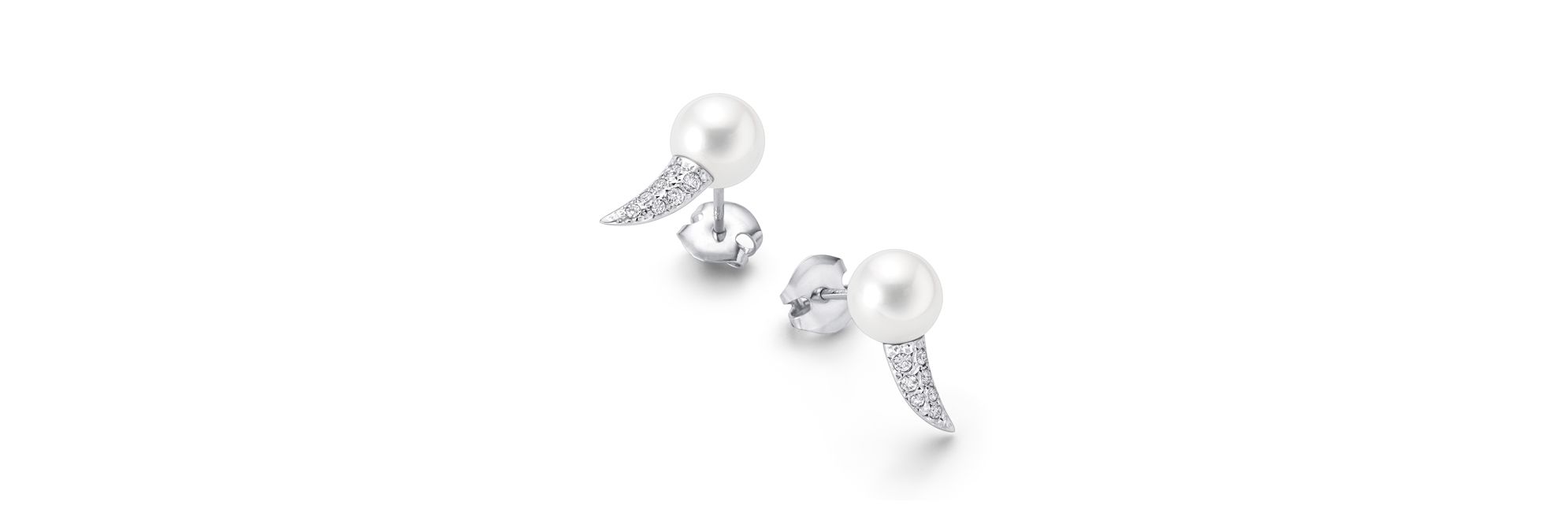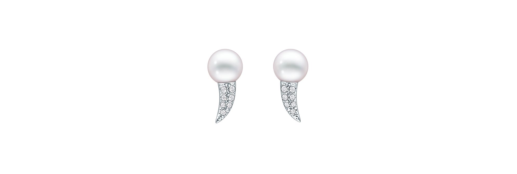 密镶钻石在18K白金利齿和圆润的阿古屋珍珠的衬托下熠熠生辉,交织出反差美感。这款耳环的锋利獠牙从莹润饱满的珍珠间探伸而出,勾勒出危险迷人的野性之美。