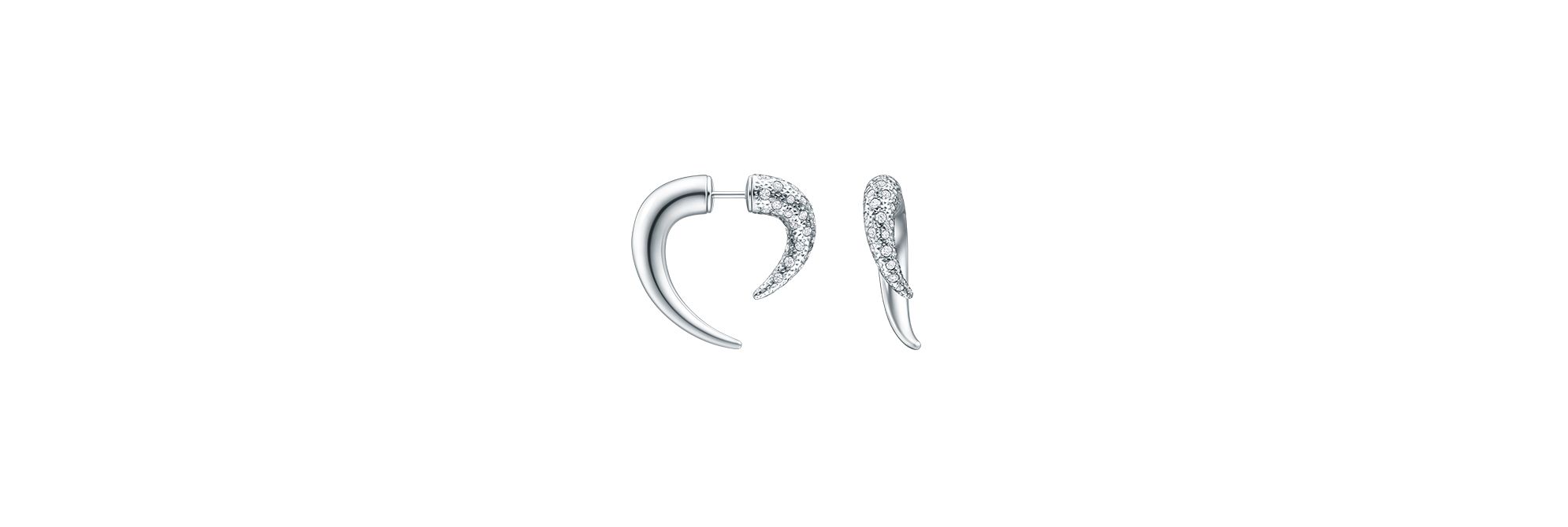 “danger horn plus diamonds pave”耳环以生动闪耀的尖角造型让人眼前一亮,与18K白金相得益彰。别致的曲线让两枚尖角仿佛朝着不同方向延伸,璀璨的密镶钻石点亮外侧尖角正面,打造低调华丽的动感造型。