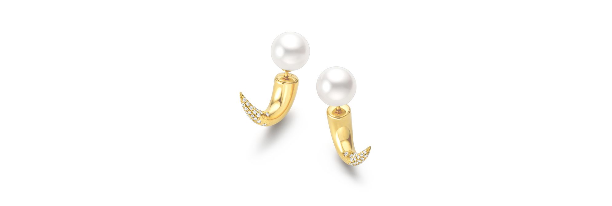 “danger horn diamonds pave”耳环以密镶钻石的18K黄金尖角为特色,张力十足的设计让每一个细节都闪耀着优雅光芒。耳环造型立体生动,丰盈的线条打造强烈的视觉冲击。莹润饱满的南洋珍珠与耳后探出的闪亮尖角,为这对耳环的华丽造型更添魅力光彩。