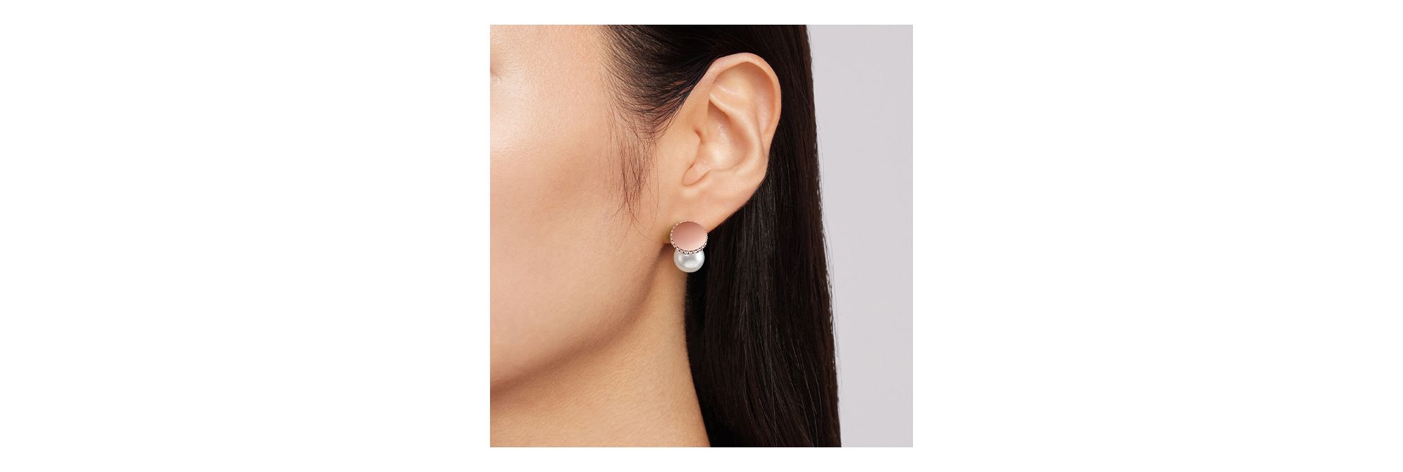 镜面般抛光的樱花金圆盘下方,一颗颇具存在感的珍珠仿佛悬浮其上,呈现出轻盈灵动的视觉美感。钻石镶嵌边缘的圆盘绽放出既璀璨又优雅的光芒,映衬着光泽流转的珍珠。随角度变幻的光影和谐交织,为侧脸打造令人印象深刻的轮廓。