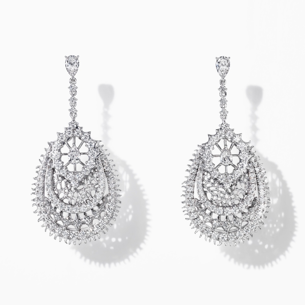 在耳环上,由铂金打造的精致网状面上镶满了钻石,借由进一步对阴影和光线淋漓尽致的运用,展现珠宝在不同光影下的奇妙奢华感。