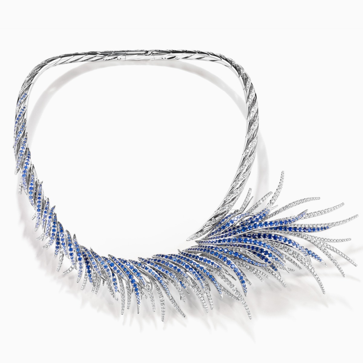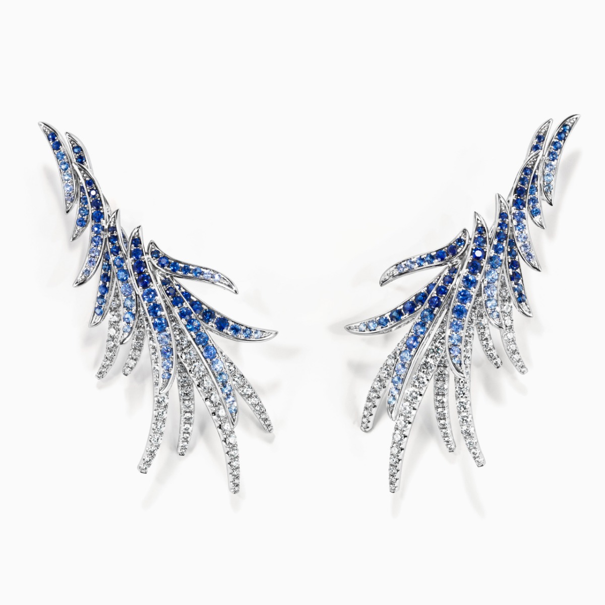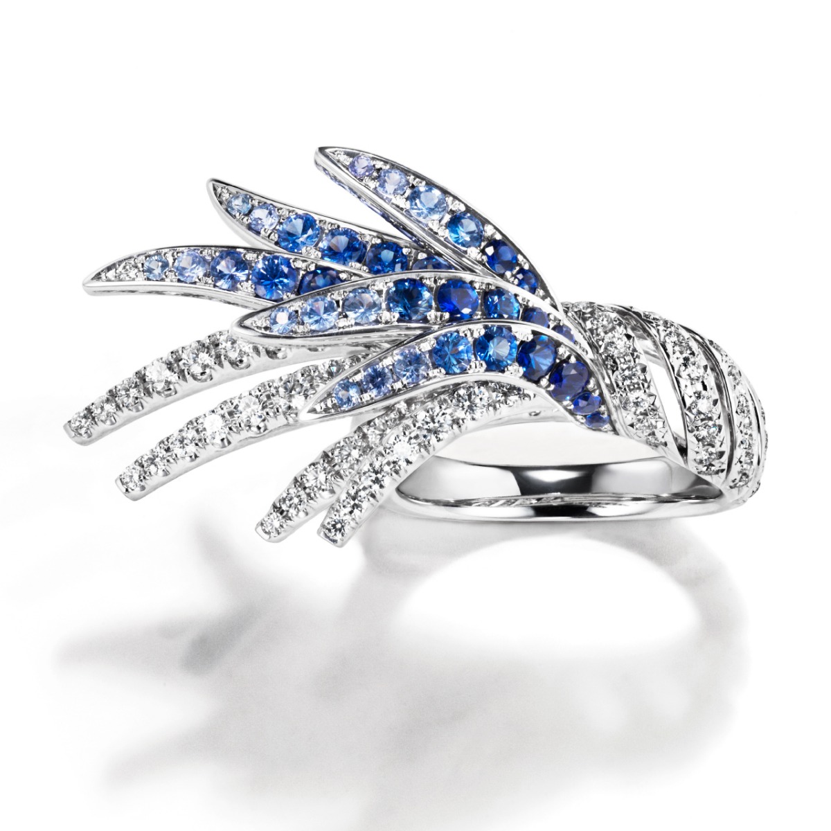 这一珠宝系列蕴含着明亮迷人的氛围,颇似华丽的化装舞会面具上随微风摇曳的羽毛。这些羽毛由拥有明亮光芒的蓝宝石和钻石精心设计而成,优雅,引人瞩目。这一系列包含了项链、戒指和耳环,可以作为全套首饰佩戴。