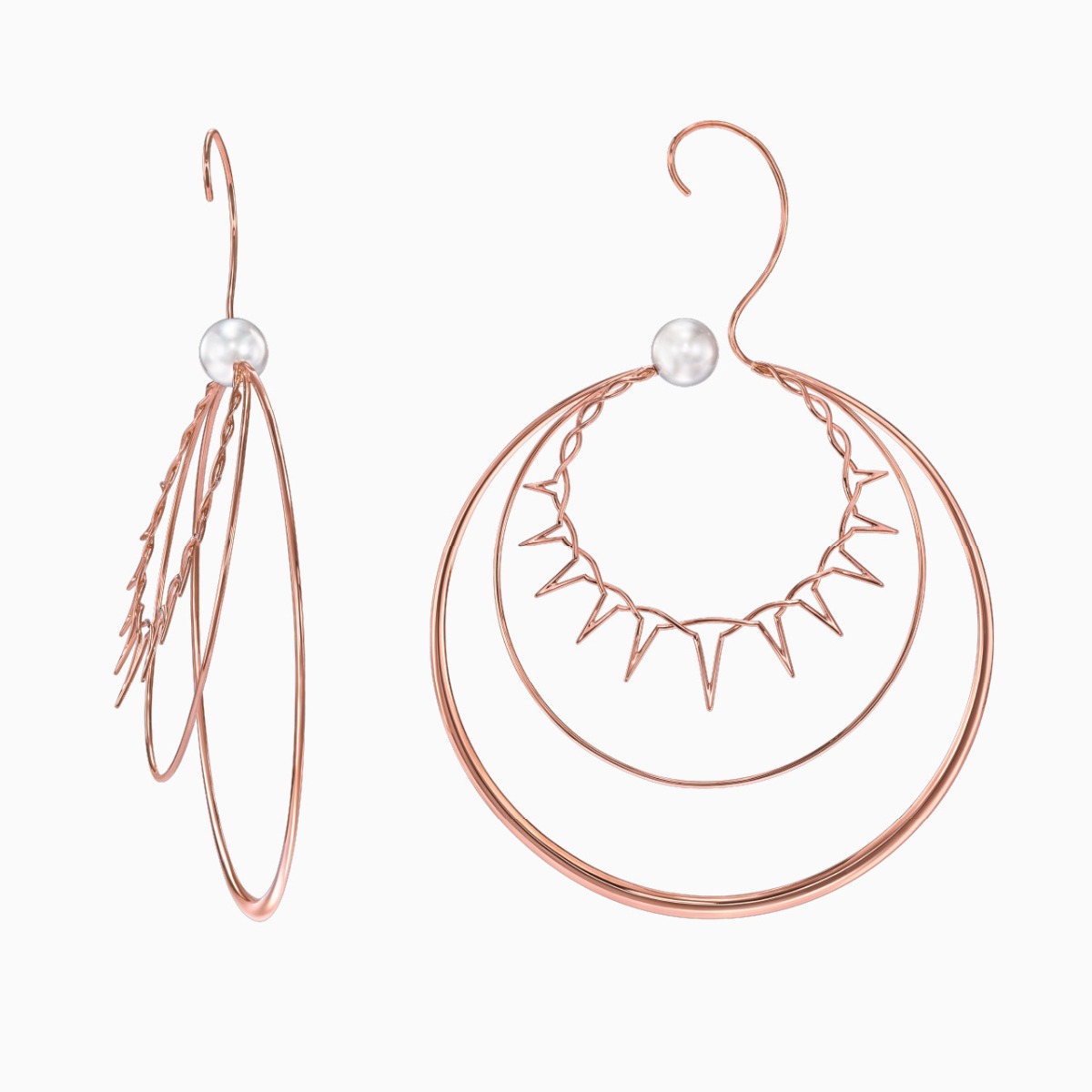 “Nacreous”系列凝聚珍珠母贝的魅力精髓。此系列夺目的线条设计灵动脱俗,令人心驰神往。这款耳环由3个樱花金圆环以及1颗南洋白珍珠组成,设计精巧而大胆,耳环垂至双肩,令举手投足间摇曳生姿。耳环的正面和背面均经过镜面抛光处理,充满活力的几何造型顾盼生辉。