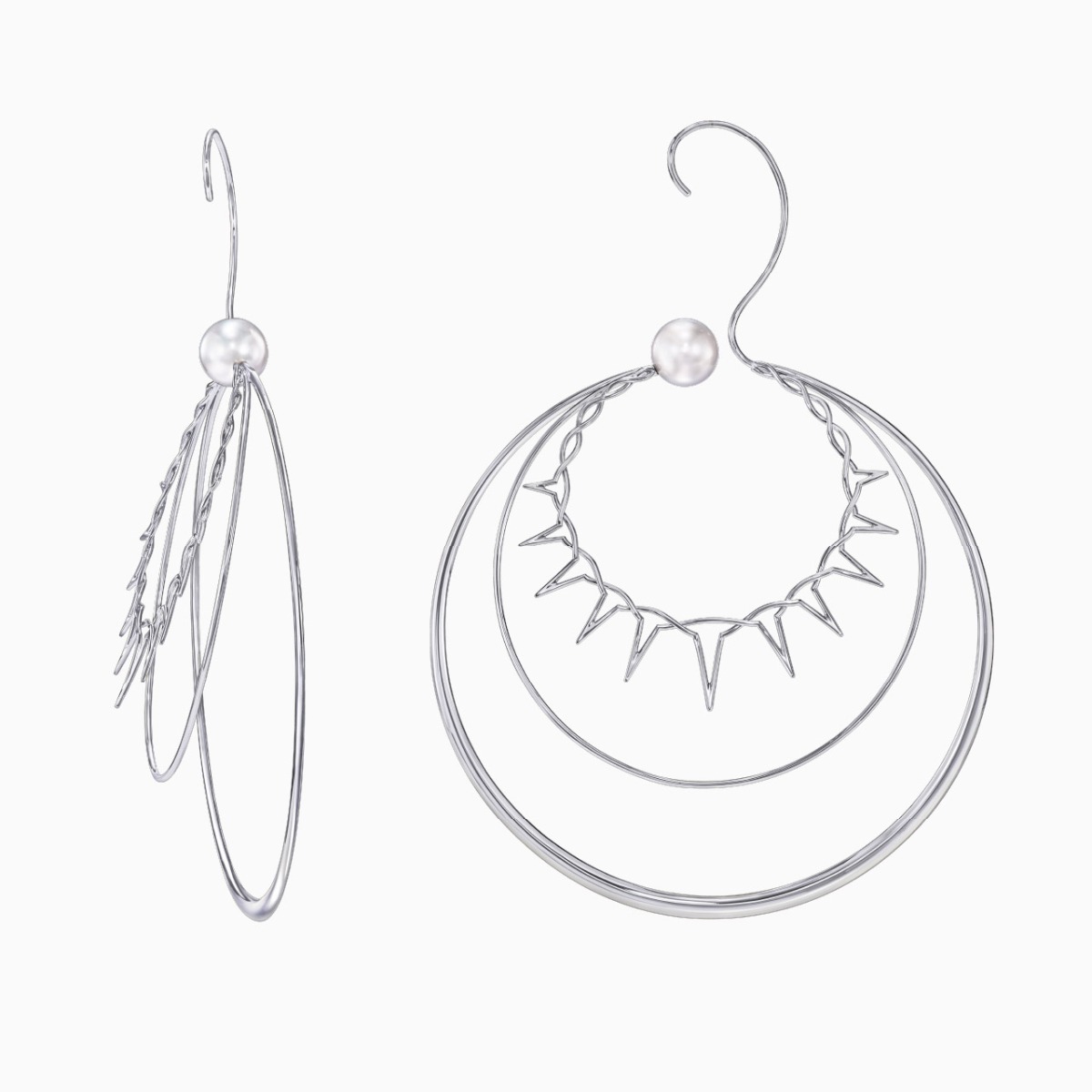 “Nacreous”系列凝聚珍珠母贝的魅力精髓。此系列夺目的线条设计灵动脱俗,令人心驰神往。这款全耳式耳环创意十足,由18K白金几何圆环组成,呈现轮辐状造型,优美包覆双耳,令珍珠仿若悬浮于空中。
