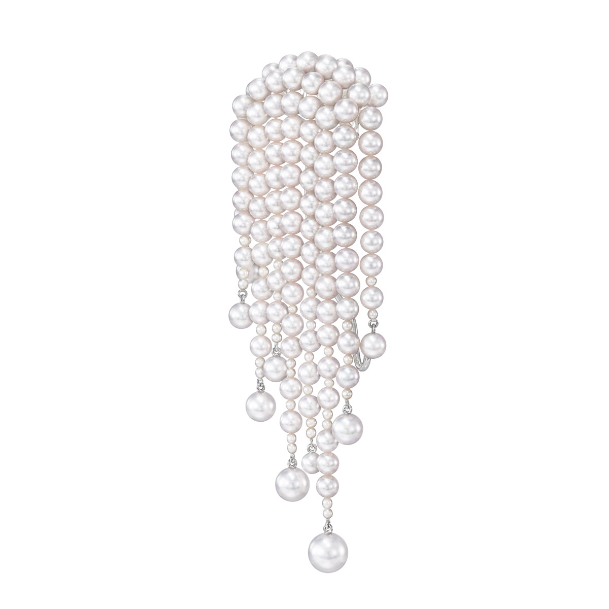 “Nacreous”系列从珍珠母贝层的虹彩色泽之中汲取灵感。这款全耳式耳环设计华美非凡,一串串珍珠如帷幕般贴覆整只耳朵,适合左耳佩戴。耳畔的莹润珍珠如繁星点点,为您的造型增添华光溢彩。
