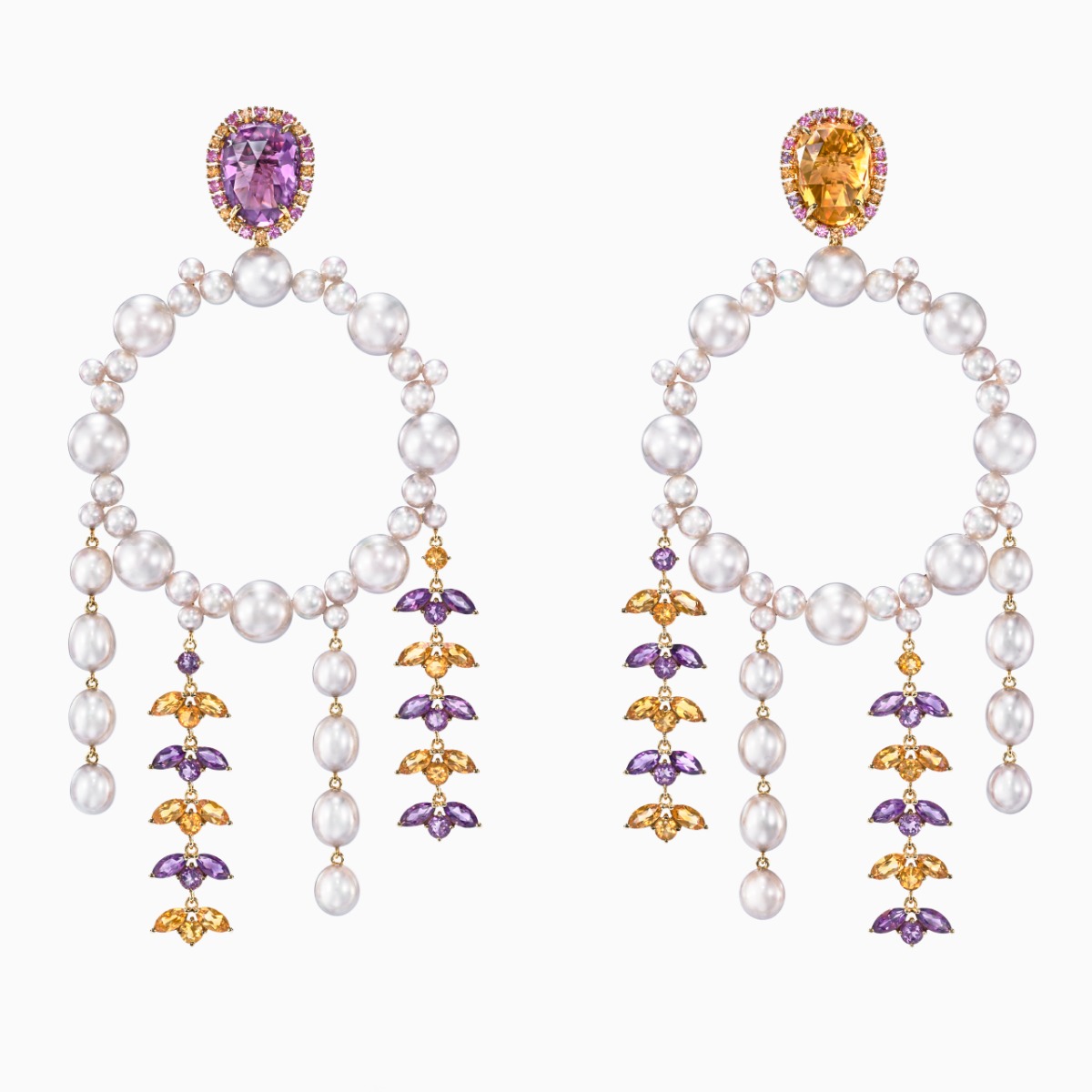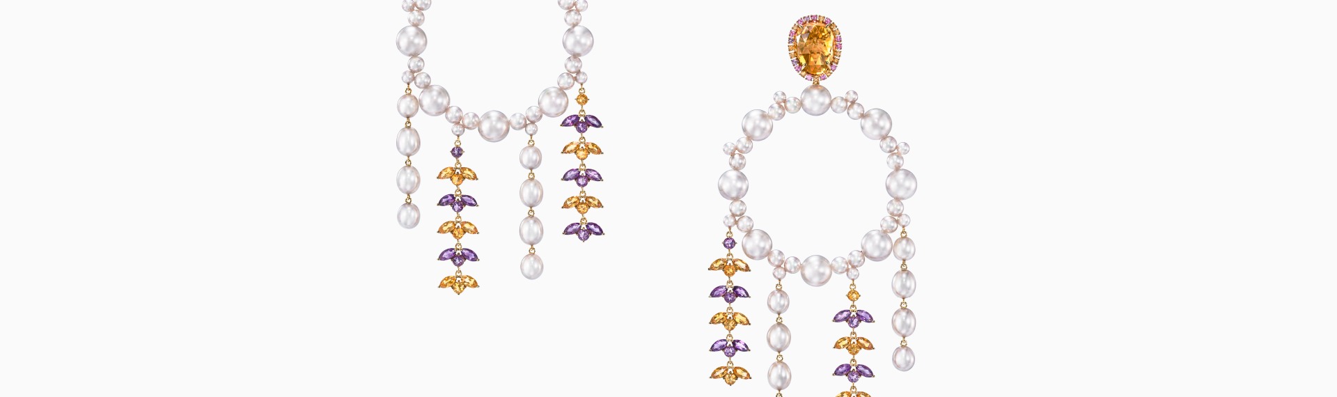 18K黄金 / 阿古屋珍珠 / 南洋珍珠 (白蝶贝) / 淡水珍珠 / 蓝宝石 (粉色、黄色、紫色) / 紫水晶 / 黄水晶