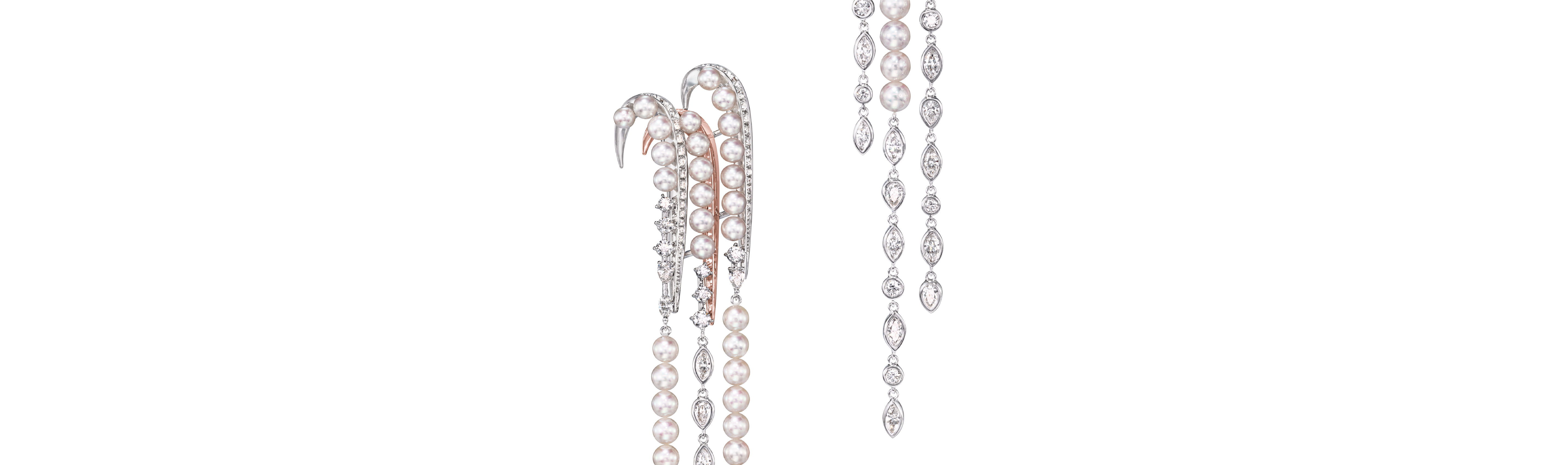 “Waterfall”系列珠宝从瀑布水流的线条中汲取灵感。这款耳环的设计由三部分组成,搭配充满东方情调的华美阿古屋珍珠。有多种佩戴方式可供选择。可尝试不同的佩戴方式,打造不对称的时尚造型。