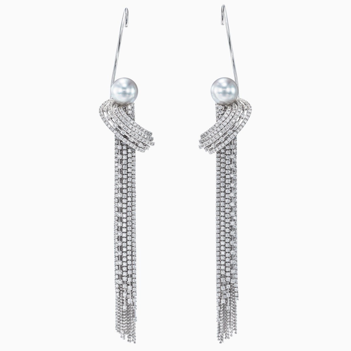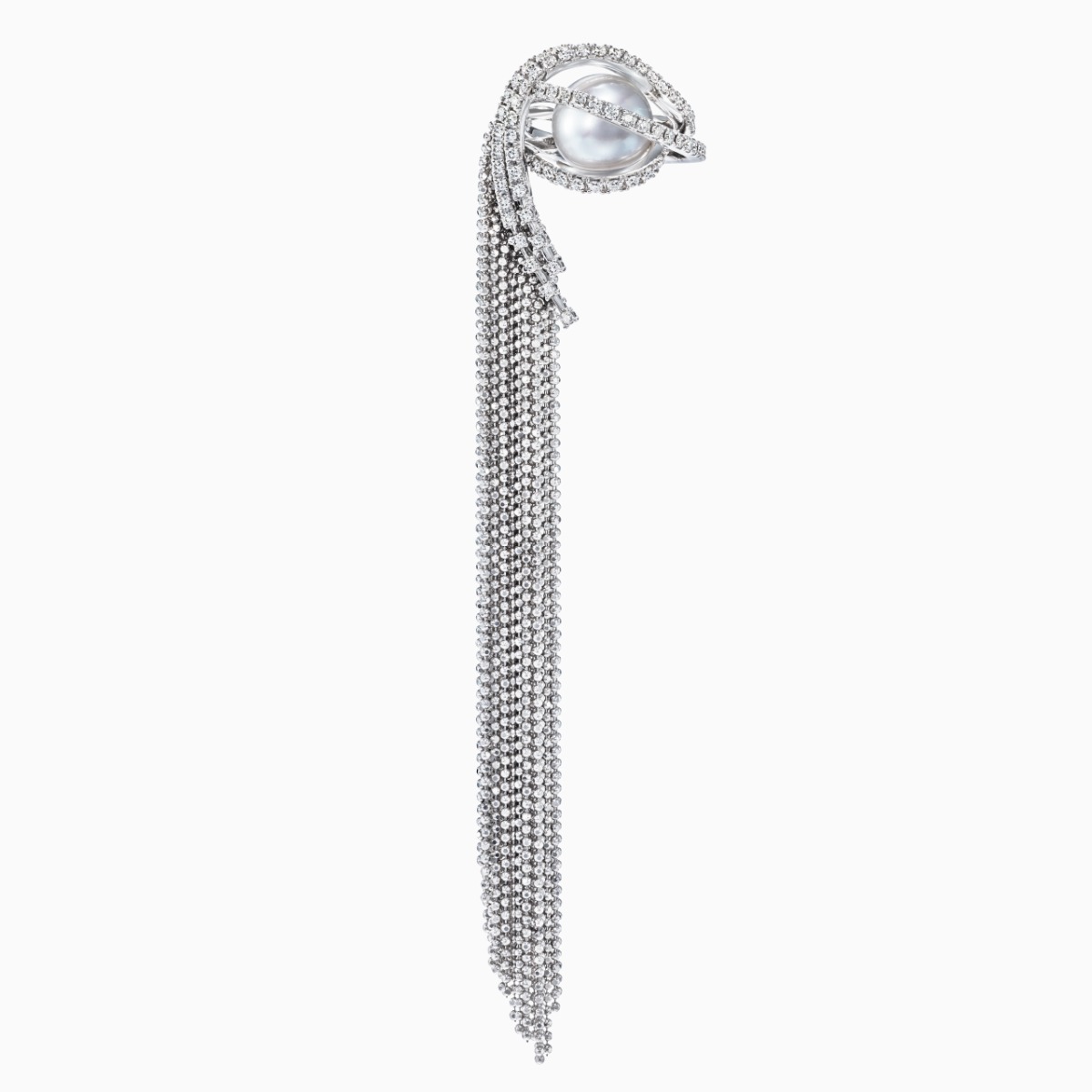 这款全耳式耳环造型精美,由钻石和球形切割链条组成的流苏熠熠闪耀,宛若波澜壮阔的瀑布。醒目的南洋白珍珠底部采用弧线设计,营造柔美的立体效果