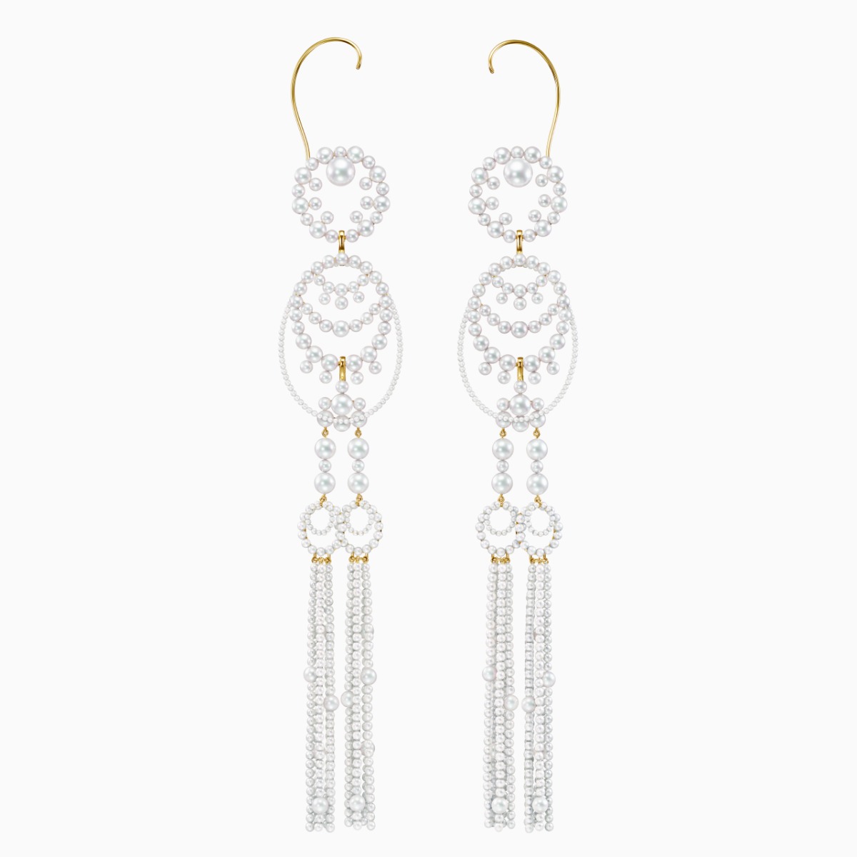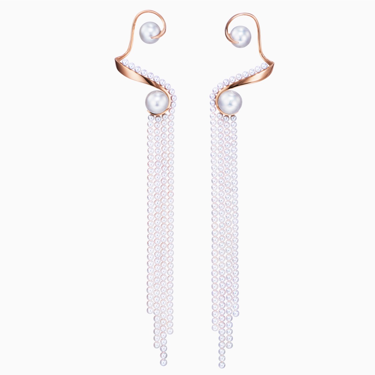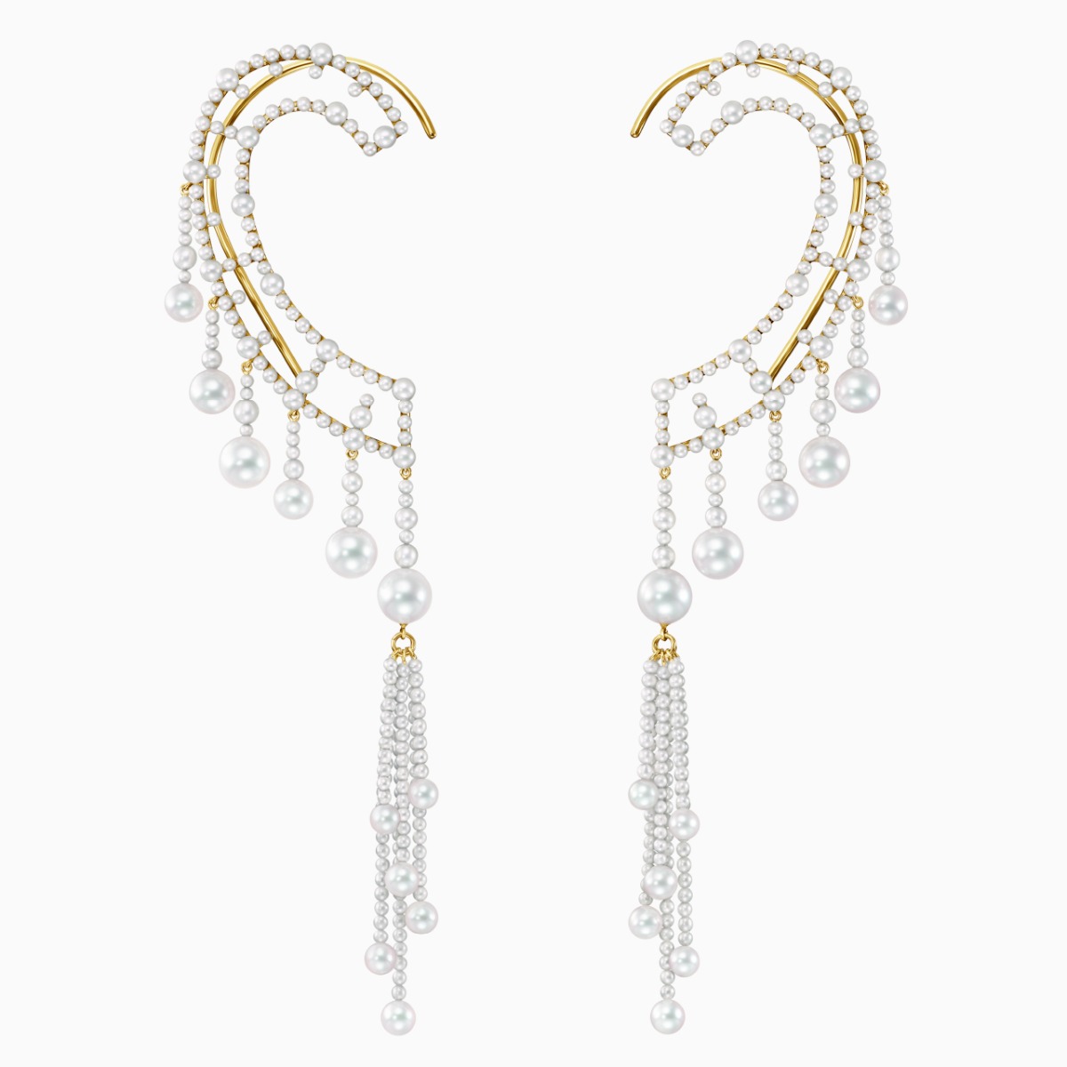 “Waterfall”系列珠宝从瀑布水流的线条中汲取灵感。这款全耳式耳环以充满东方情调的华美阿古屋珍珠勾勒耳廓曲线。举手投足间,珍珠流苏摇曳生姿。