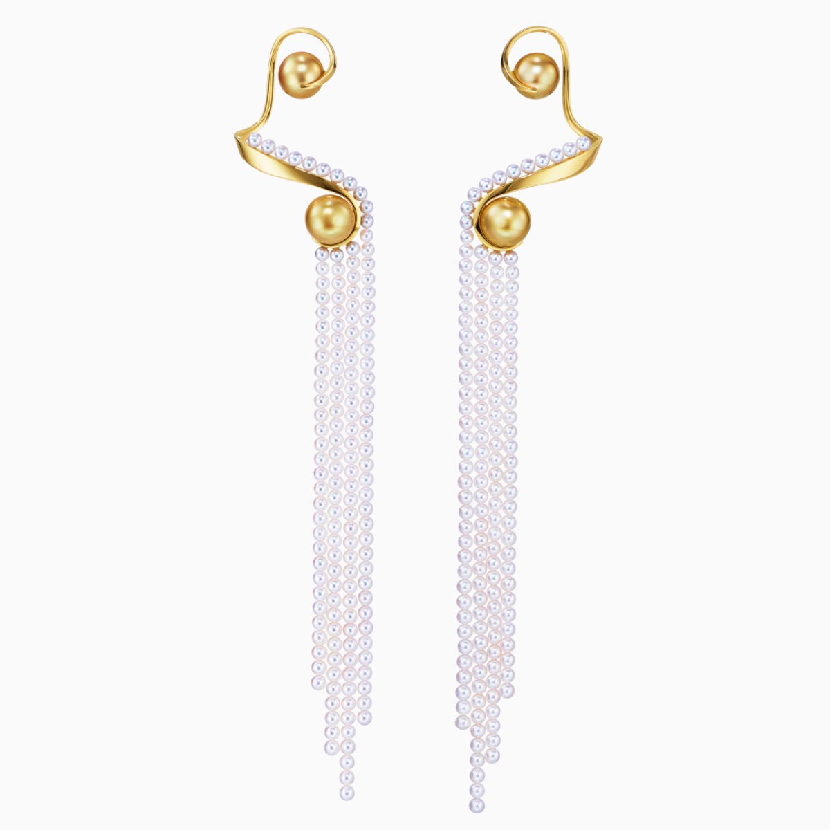 “Waterfall”系列珠宝从奔流而下的壮阔瀑布中汲取灵感。这款耳环以夺目的金色南洋白珍珠点缀黄金创意造型,打造贴合耳畔的独特三维立体结构。由阿古屋珍珠组成的流苏灵动飘逸,优雅生姿。