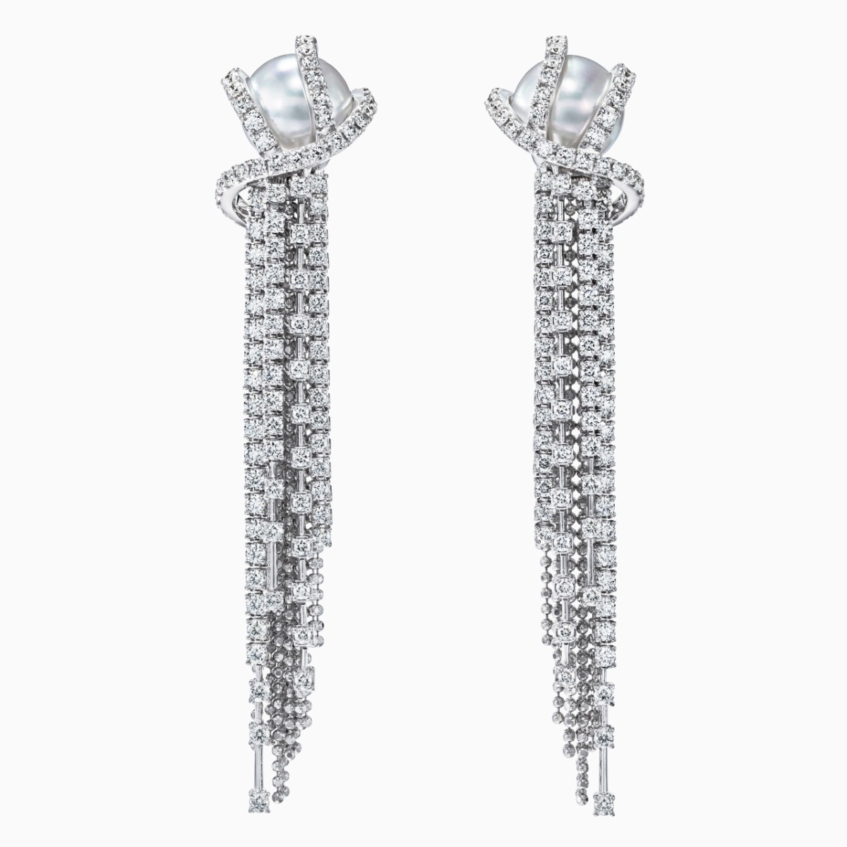 这款时尚的耳环造型精美,华美的南洋白珍珠、钻石与球形切割链条相映成辉,勾勒出波澜壮阔的瀑布景象。钻石流苏萦绕着珍珠,令人联想起优雅倾泻而下的水流,美轮美奂。