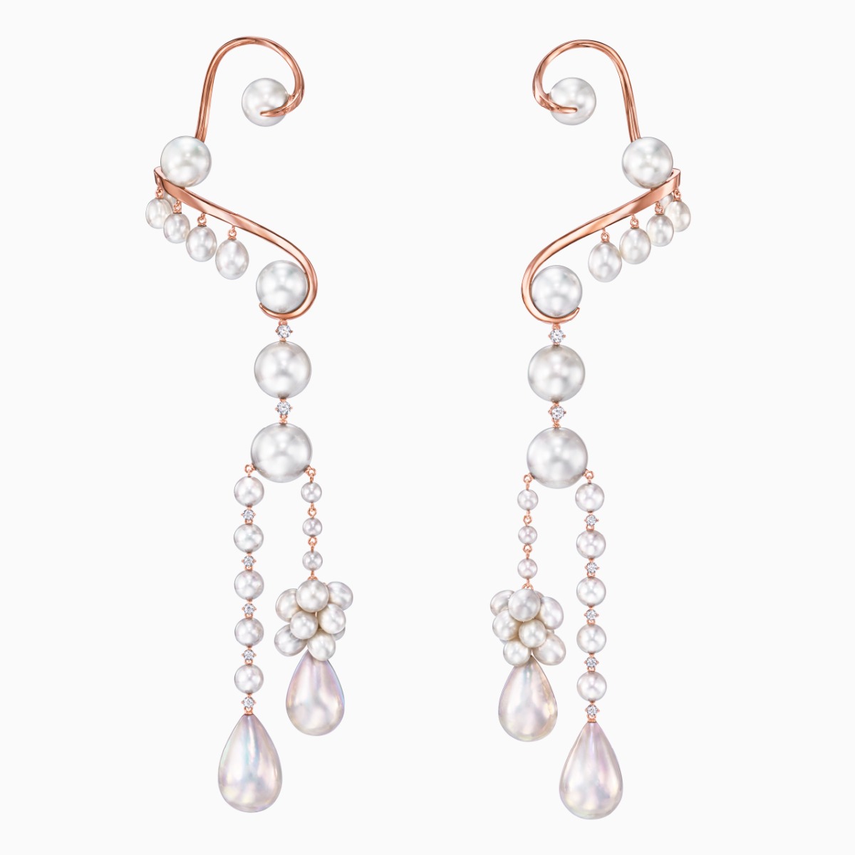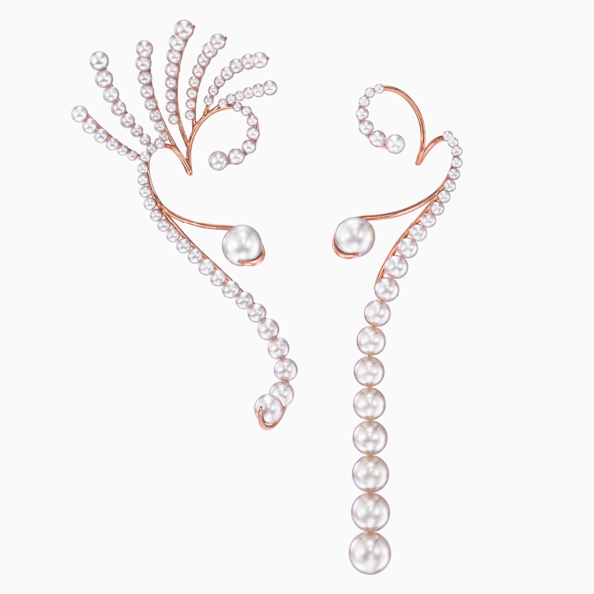 TASAKI “Waterfall”系列将瀑布充满生命力的天然之美演绎得淋漓尽致。这款耳环饰有TASAKI四种不同品种的珍珠,包括阿古屋珍珠、南洋白珍珠、淡水珍珠和马贝珍珠。它们沿樱花金流畅曲线和优雅的笔直线条排列,营造无限美感。颜色、形状和大小各异的珍珠错落有致,更突显了它们的独特魅力。