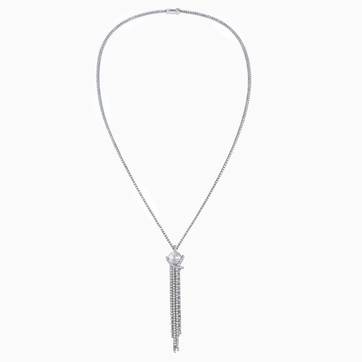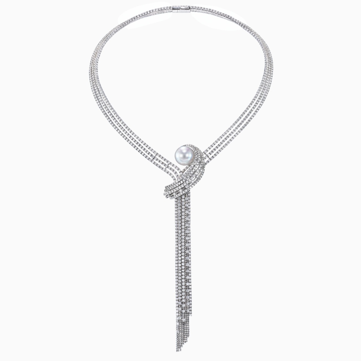 这款项链造型精美,由钻石和球形切割链条组成的流苏熠熠闪耀,宛若波澜壮阔的瀑布。一颗华丽的南洋白珍珠点缀于项链的偏心位置,为颈间增添华美光泽。