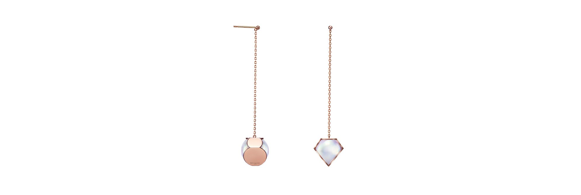 TASAKI “FACETED”系列珠宝将马贝珍珠镶嵌于樱花金框架中,勾勒钻石形态,呈现极简设计。这款耳环以珍珠和钻石图案象征恒久爱意。利落的正面造型与柔美的侧面造型形成鲜明对比。