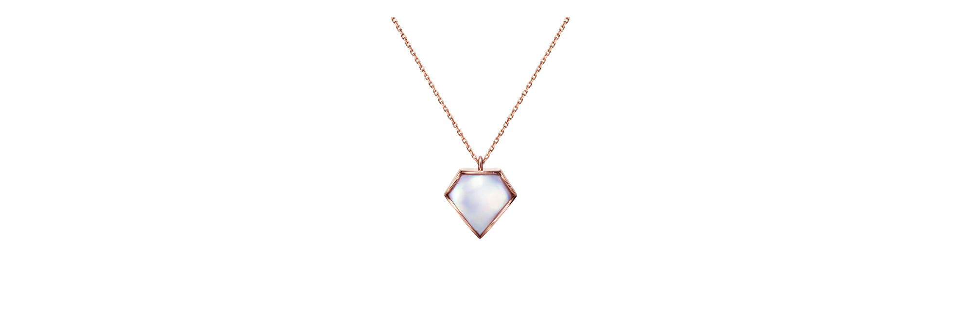 TASAKI “FACETED”系列珠宝将马贝珍珠镶嵌于樱花金框架中,勾勒钻石形态,呈现极简设计。这款吊坠以珍珠和钻石图案象征恒久爱意。利落的正面造型与柔美的侧面造型形成鲜明对比。