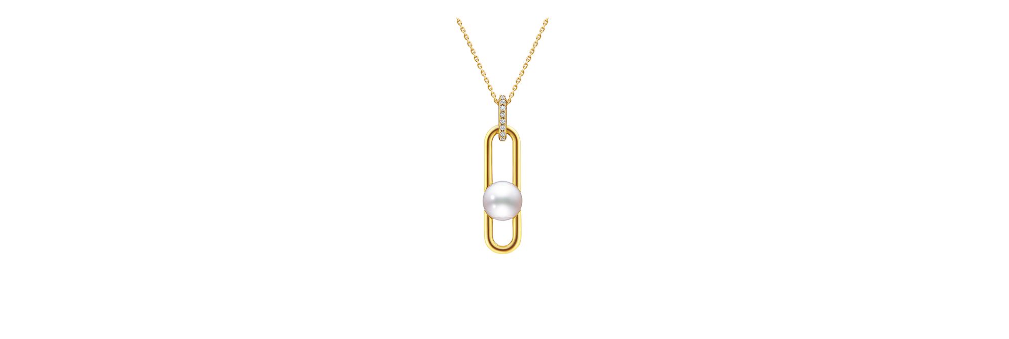 这款吊坠造型经典而不失新意,将珍珠镶嵌于瞩目的金属链环中,更添一抹柔美魅力。