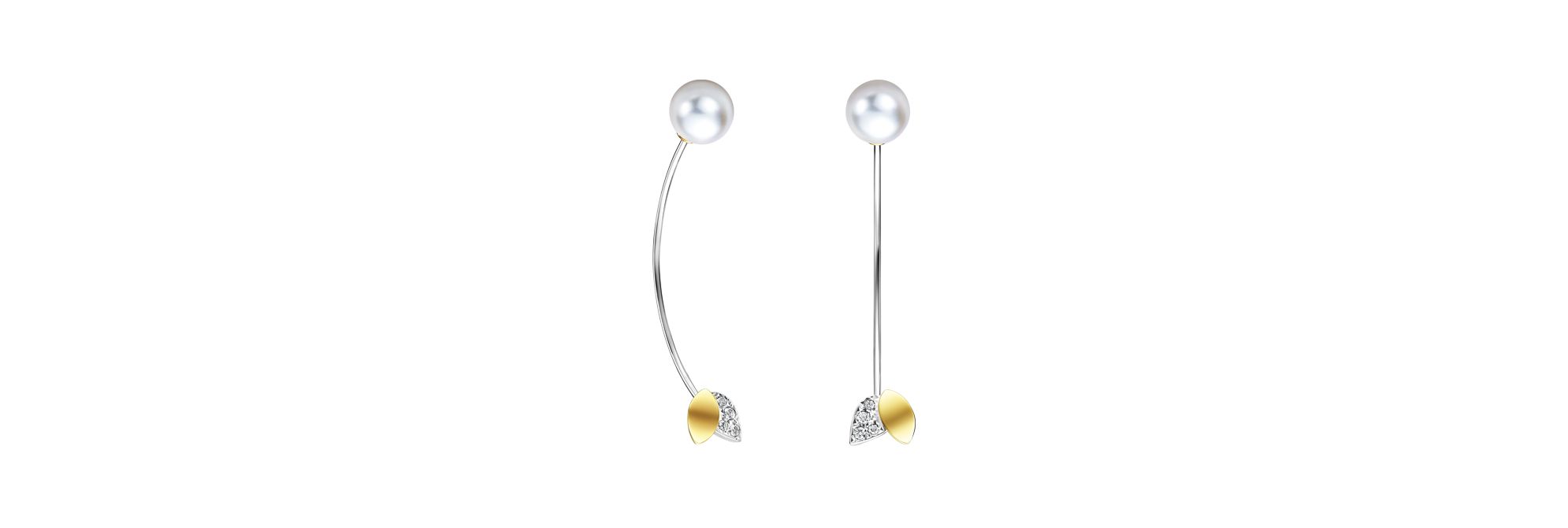 这款耳环采用18K黄金和璀璨夺目的钻石营造出花瓣的娇俏美感。18K白金弧线串起可爱的花卉图案与单颗珍珠,为作品注入自然美感。