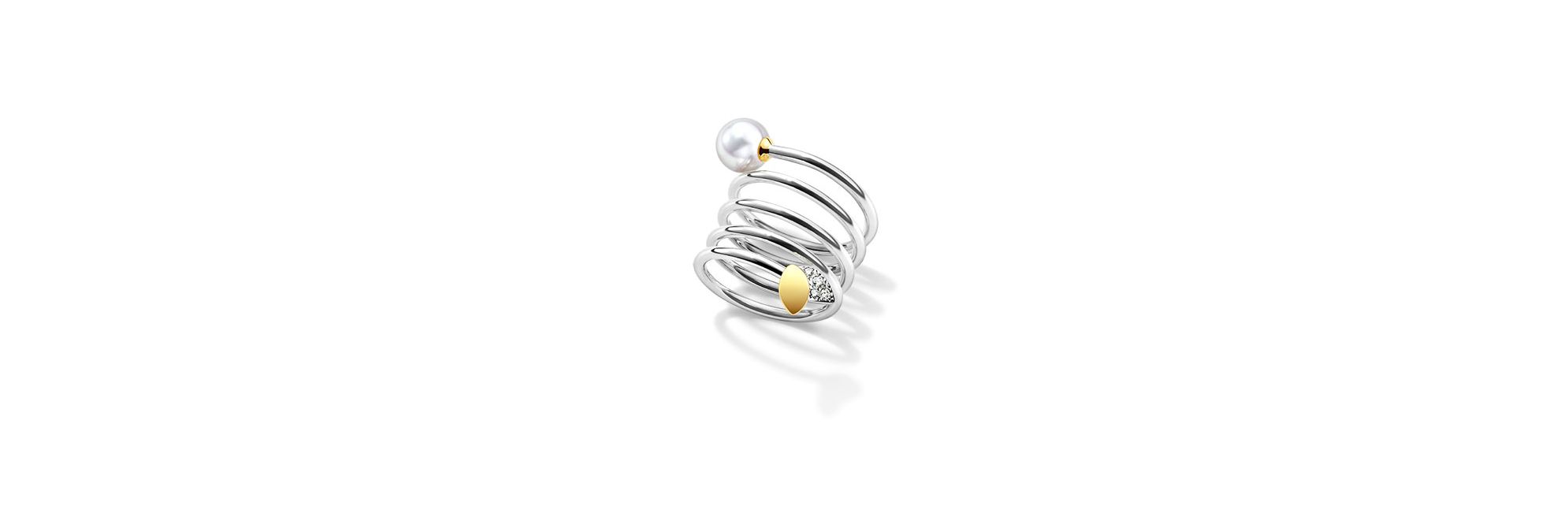 “FLORET”系列以古法语“花簇”命名,娇巧的小花搭配两片叶子,与蜿蜒生动的藤蔓形成鲜明对比。白金螺旋藤蔓缠绕指间醒目点缀黄金,洋溢现代气息。这款风格灵动的戒指饰有阿古屋珍珠和密镶钻石,活力设计彰显柔美的女性魅力。