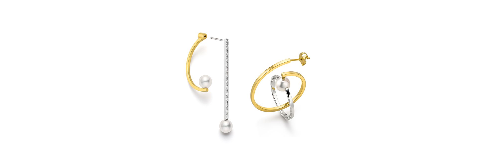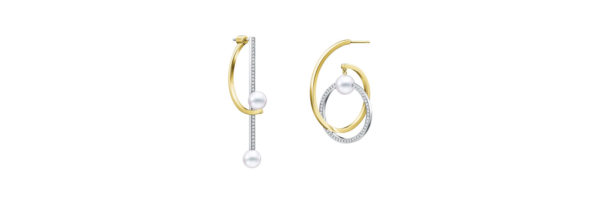 TASAKI “kinetic”系列演绎了宇宙恒星运转的美丽景象。这款时尚耳环采用不对称设计,以18K白金和18K黄金材质打造直线与曲线,在珍珠之间相互交错。密镶钻石闪耀动人,令耳环更显前卫时尚。