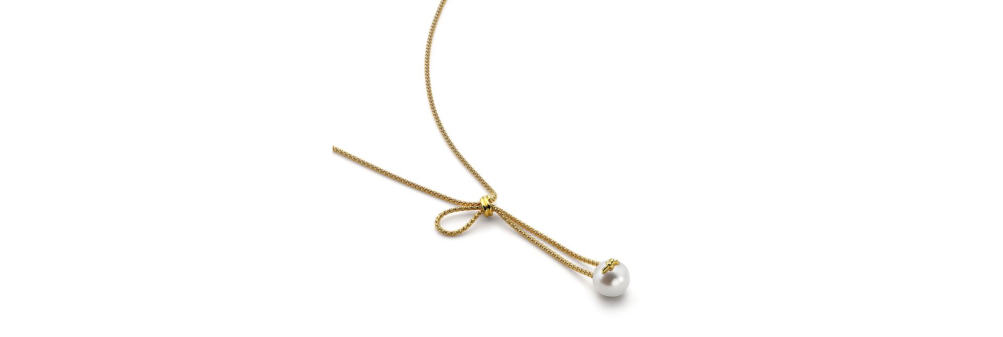 TASAKI “KNOT”系列珠宝以时尚风格演绎传统绳结,再现英国维多利亚时期备受欢迎的爱情象征。这款时尚的项链以18K黄金铸就优雅链条,贯穿单颗珍珠,并于末端缠结。