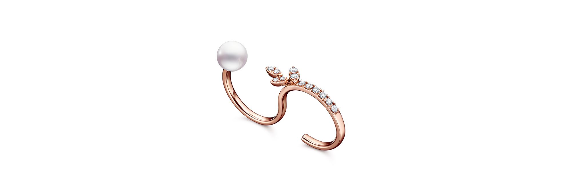 这款樱花金双指戒指以圣诞树的缤纷装饰为灵感 鉴于装饰是以苹果为原型,该系列创意亦融入果叶为设计元素 阿古屋珍珠与钻石交相辉映,渲染出浓烈的节日气氛。