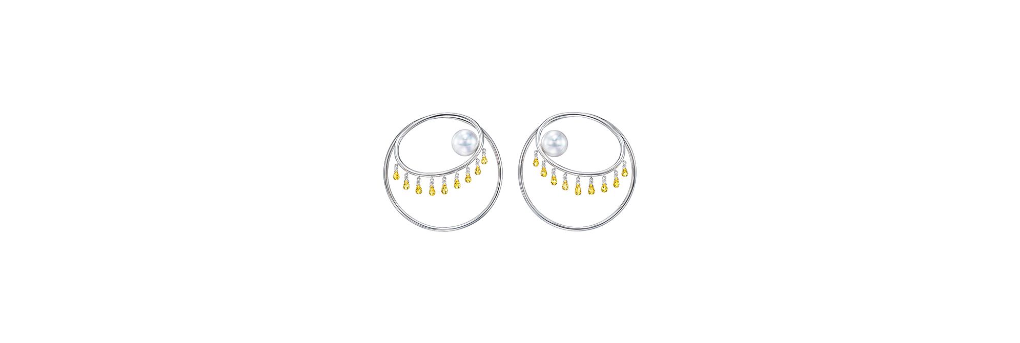 “Nacreous”系列珠宝从珍珠母贝的瑰丽皮层中汲取灵感。精美圆环与椭圆形环圈相结,形成夹角,南洋白珍珠栖缀其上,呈现出珍珠在贝壳中生长的景象,悬浮于耳畔。举手投足间,水滴形切割的黄色蓝宝石摇曳生姿。