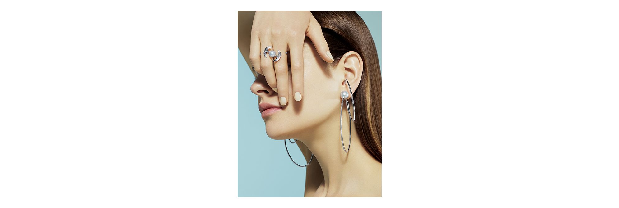 “Nacreous”系列珠宝凝聚了天然珍珠母贝精粹。这款耳环的白金环圈从耳后环绕,营造穿过耳屏的错视效果,极具创意。南洋白珍珠散发奢华魅力。